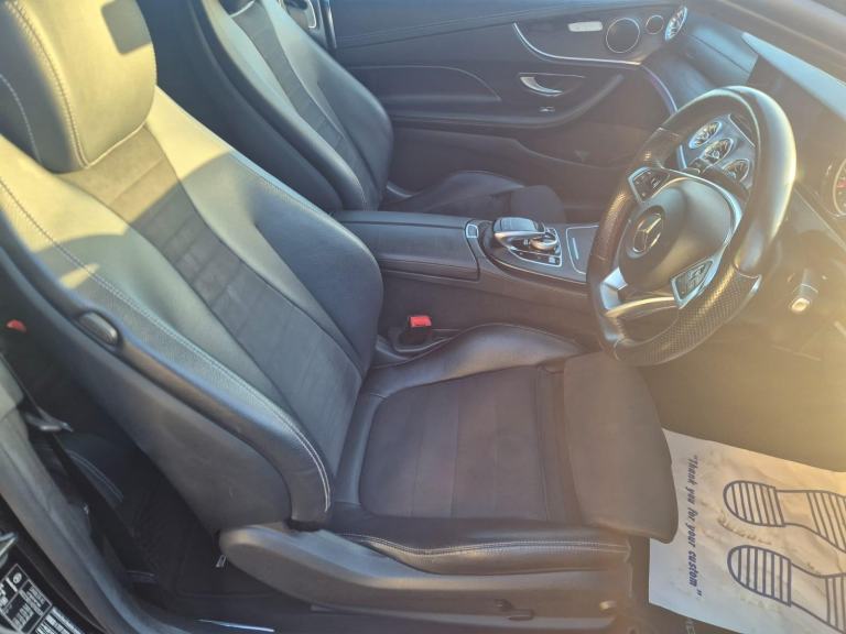 Finished in sleek black, this Mercedes showcases AMG bodystyling with front and rear aprons, side skirts, and a body-coloured AMG boot lid spoiler, complemented by striking 19’’ 5-twin-spoke alloy wheels in titanium grey with high sheen. Inside, it offers black leather and velour heated comfort sport seats, a 3-spoke AMG multifunction steering wheel trimmed in black Nappa leather with a flattened bottom section, and a choice of driving modes including ECO, Comfort, Sport, Sport+ and Individual. Practicality meets luxury with a reversing camera, automatic dual-zone climate control, front and rear parking sensors, keyless go, electric heated adjustable mirrors, electric windows, cruise control with speed limiter, remote central locking, active brake assist, and an electric parking brake. The exterior is enhanced by LED headlights with integrated daytime running lights, rear LED lights, twin exhaust pipes, green tinted glass, and front door sills with Mercedes-Benz lettering, while the cabin is elevated by 64-colour ambient lighting, a reach and rake adjustable steering column, stowage package, multifunctional trip computer, tyre pressure monitoring system, ISOFIX child seat preparation, split folding rear seats, and remote boot release.