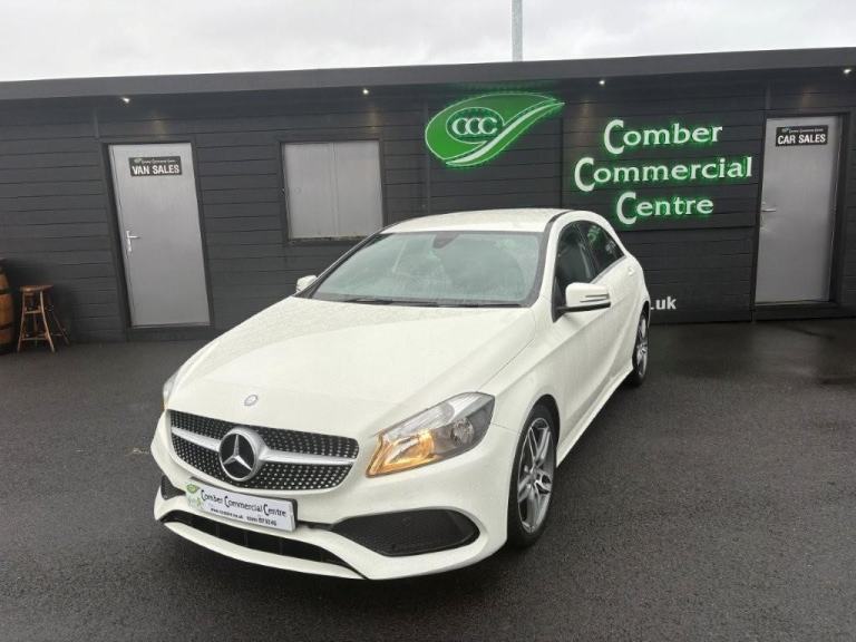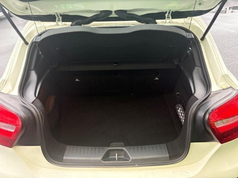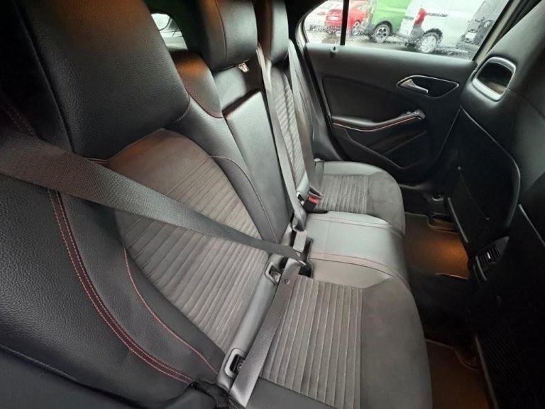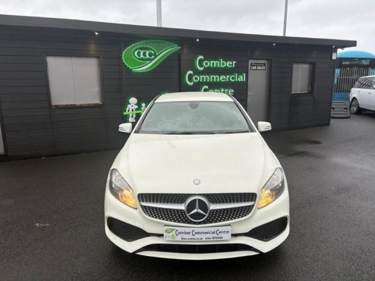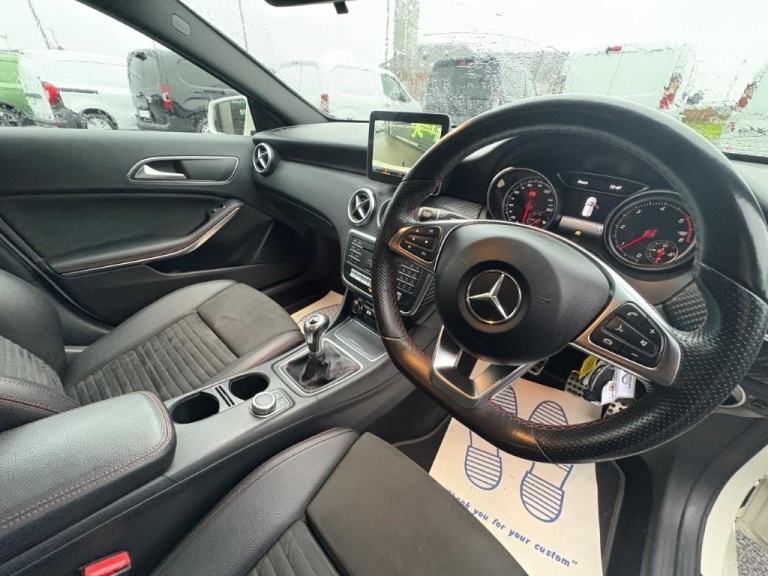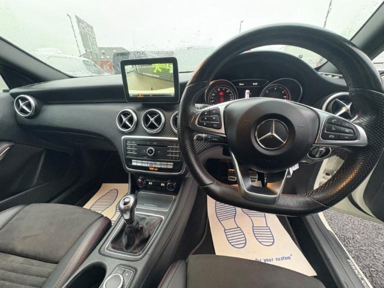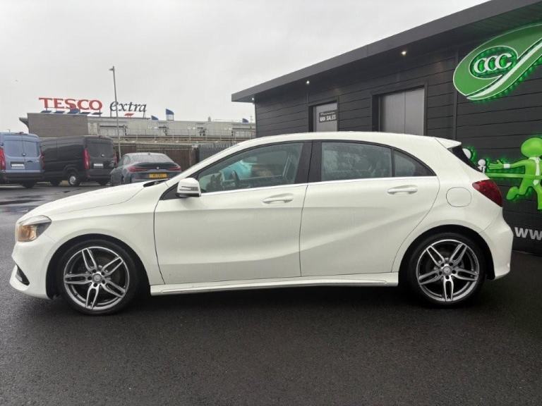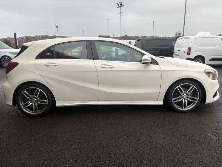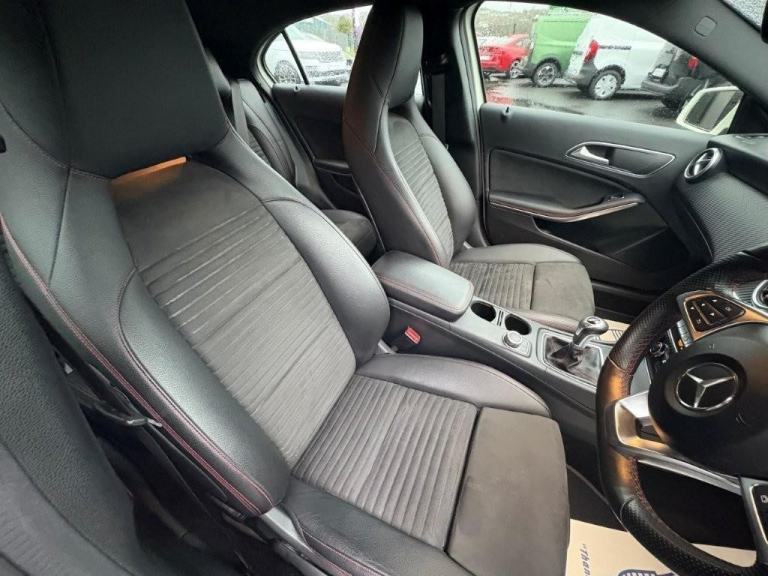 This white hatchback delivers a premium driving experience with sporty styling and advanced features, equipped with 18’’ AMG 5 twin-spoke alloy wheels in Titanium Grey, AMG body styling, black leather seats with red stitching, and sport seats for added comfort. It includes a reversing camera with 180-degree parking guidelines, automatic two-zone climate control, multiple driving modes (ECO, Comfort, Sport, Sport+ and Individual), adaptive brake assist with hold function, hill start assist, and an electric parking brake. Convenience is enhanced by electric heated adjustable door mirrors, electric windows, halogen headlights, daytime running lights, and a 3-spoke leather steering wheel, while safety and practicality are supported by a tyre pressure monitoring system, collision prevention, ISOFIX child seat preparation, split folding rear seats, and a reach & rake adjustable steering column. Additional touches such as Mercedes-Benz illuminated door sills, a centre console, and a trip computer complete the premium and sporty package.