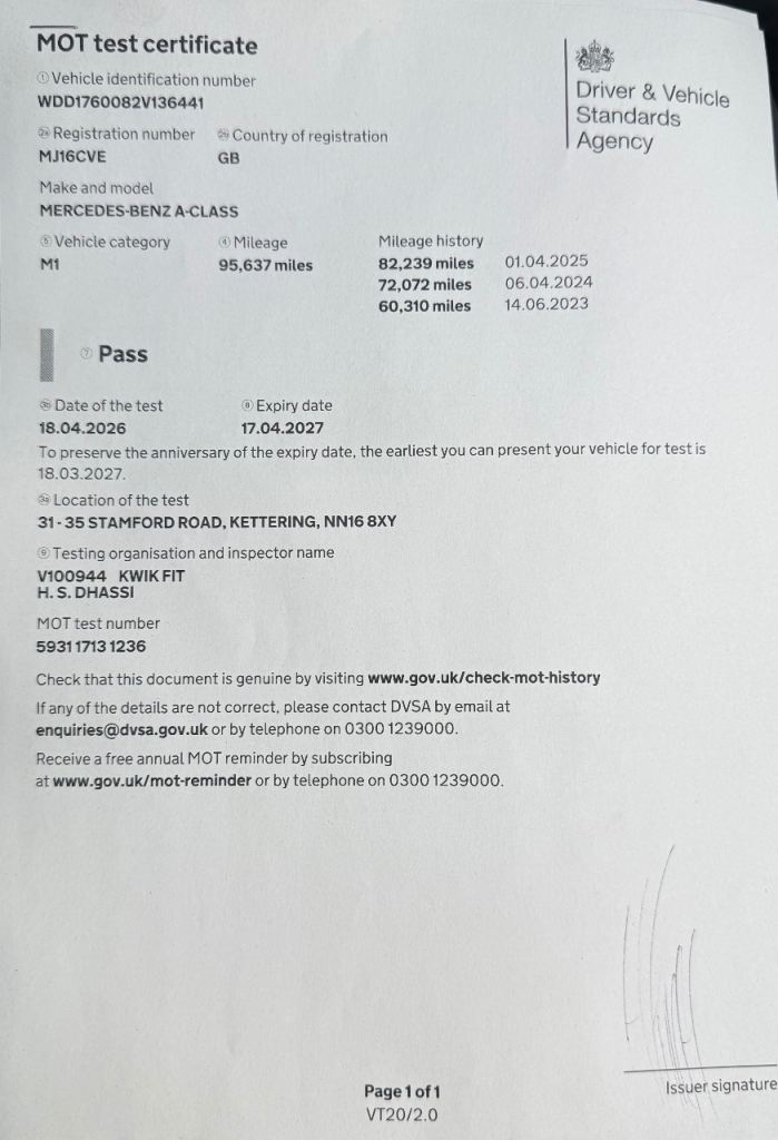 Fresh MOT β Passed first time with NO ADVISORIES