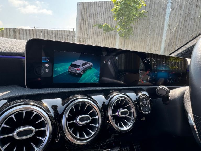 Mercedes-Benz A Class A200 AMG Line Premium 5dr Auto in Grey with contrasting 18inch diamond cut alloy wheels, this car is packed with extras including Navigation, Cockpit, ambient lighting pack plus lots more.