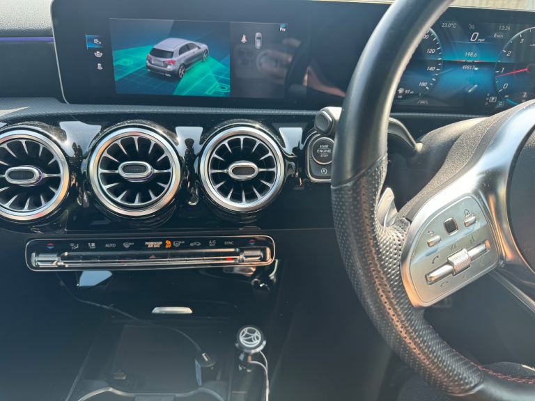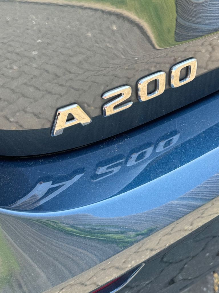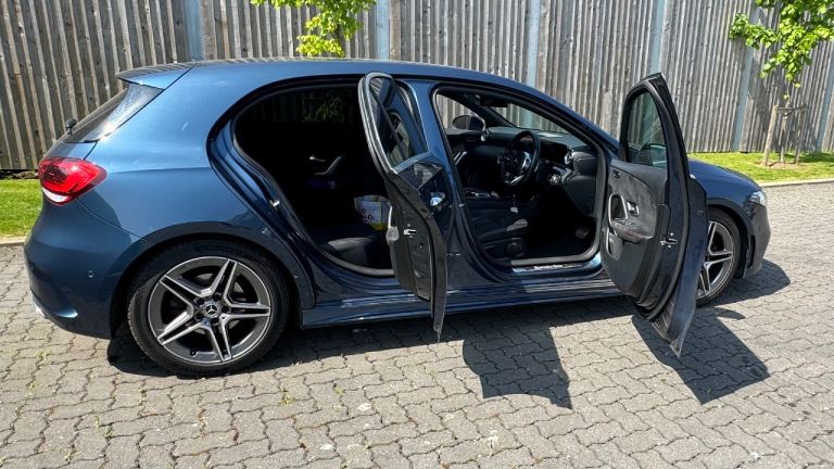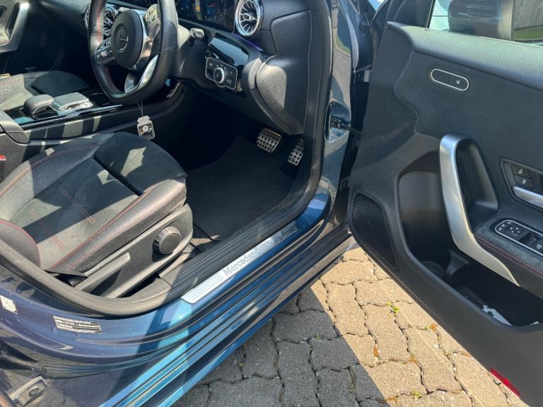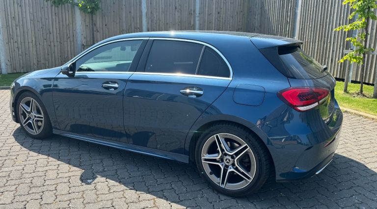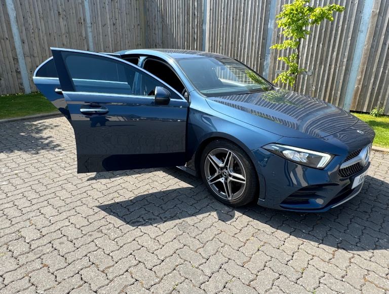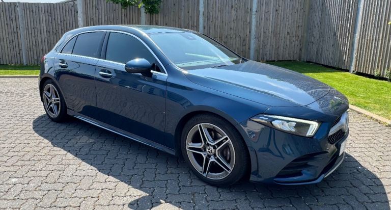 Mercedes-Benz A Class A200 AMG Line Premium 5dr Auto in Denim Blue with contrasting 18inch diamond cut alloy wheels, this car is packed with extras including Navigation, Cockpit, ambient lighting pack plus lots more.