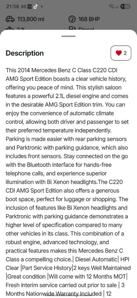 Mercedes c220 cdi amg sport edition G tronic 2014 very clean HIGH Spec HPI CLEAR including sunroof,heated front seats,reverse camera,loud 8 speaker audio system and intelligent light system New break pads and new break disks were done about a week ago from the dealership also NEW MOT has been done and also a fresh service
