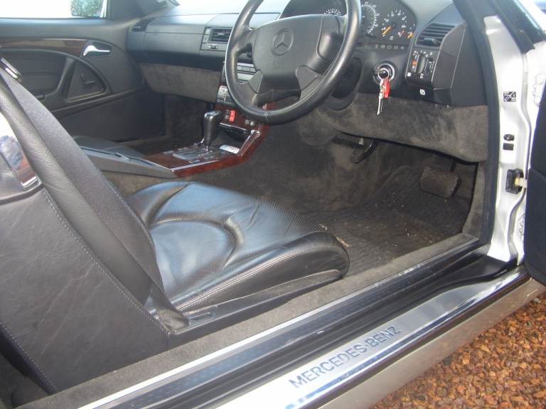 Mercedes SL 320 Convertible. 1997, Auto, Silver with Black Nappa Leather , Full Mercedes service history from new. 69878 miles. 1 previous owner. I have owned this car for 26 years and has always been garaged. Car will be MOT'd when sold. Glass panoramic roof with black convertible soft top roof unmarked , Auto. 2 Keys , Mercedes carpet mats , CD multiplayer in boot. Straight 6 cylinder. All original. Spare wheel has never been on car. Private Reg not with car . Non Smoker, Comes with mobile hard top storage frame and cover. £12000.00