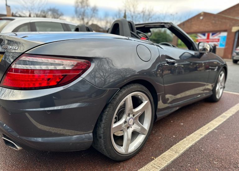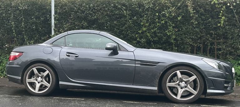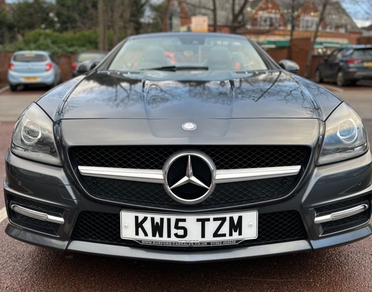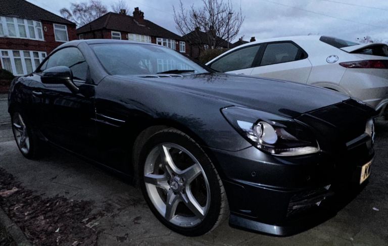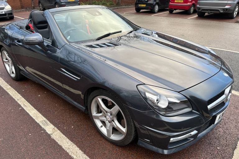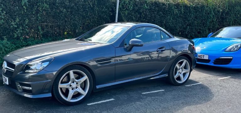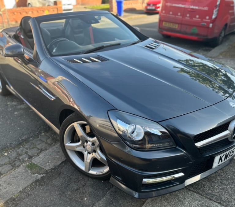 Stunning Mercedes SLK 350 only 49K with lots of history. 65 plate 2015 in a rare Tenorite grey finish with black leather heated seats with contrasting red stitching and red seat belts. Extras inc air scarf heated seats air con cruise control front and rear parking sensors attention assist traffic sign assist Mercedes Command System Sat Nav Blue Tooth for mobile and music. Car drives like it’s new and everything works as it should. No faults. The roof operates perfectly no leaks. 2 original keys fobs. The wheels could benefit from a refurb, light curb damage can get done back to original paint, there are few light scratches that will buff out and I will put a fresh MOT on it. I had a full inspection by Nick Giles Car inspections he specialises in Mercedes Porsche Audi and I ve had it for nearly 3 years and only fine around 10K in it since I got it. Warranty available for extra. This is the newest and best 350 I ve seen on line for ages they don’t come up like this very often . Open to offers and poss part ex any questions feel free to call. Car is inManchester.
