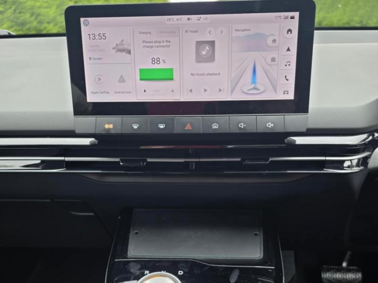 3x3 point rear seatbelts, Active emergency braking with pedestrian/Bicycle detection, Door open warning, Drivers seatbelt reminder, Dual front airbags, Front and rear passenger seat belt reminder, Front passenger airbag deactivation switch, Front seatbelts (3-point + pretensioner + load limiter), Front side airbags, Rear door child safety locks, Rear seat ISOFIX x2, Side curtain airbags, Tyre pressure monitoring system, Alarm & Engine Immobiliser, 4 regenerative braking mode (Auto, 1, 2, 3), Anti-lock Brake System and Electronic Brakeforce Distribution, EBA, Electronic Stability Programme, Hill start assist, Automatic dimming rear view mirror, Electrically adjustable power folding heated black door mirrors, Front and rear electric windows with one-touch up/down, Rain sensing wipers, Rear privacy glass, Rear wiper, Tinted glass, Active grille system (AGS), Rear side wing doors, Solid paint, Twin aero rear spoiler, Two tone black roof, Auto headlights, Intelligent high beam, LED centre brake light, LED daytime running lights integrated into front bumper indicator lights, LED rear lights, Projector LED headlights with reflective technology, Rear centre light bar with cross hatch design effect, 2nd row 60/40 split fold seat, 3 rear headrests, 3 seat bench in 2nd row, 4 way adjustable passenger seat, 6 way electric adjustable drivers seat, Front headrests, Heated front seats, Single front passenger seat, Heated steering wheel, Height adjustable loading floor, Leather steering wheel, Leather style with cloth inserts upholstery, Rake/reach adjustable steering wheel, Climate control, 360 degree parking camera, 5 driving modes (Eco, sport, snow, custom, standard), Adaptive cruise control, Blind Spot Detection (BAS), Driver attention assist, Intelligent speed limit assist with traffic sign recognition, Lane change assist, Lane keep assist system (LAS) with Lane departure warning system (LDWS), Power assisted steering, Rear cross traffic alert, Rear parking sensors, 10.25" floating colour touchscreen, 7" Full digital driver information display, Satellite Navigation, Traffic jam assist, Android Auto, Apple CarPlay, E-call, iSmart with live services (additional services include weather, live traffic, amazon prime), Mobile phone bluetooth key, Wireless Mobile Phone Charger, 6 speaker audio system with 3D sound, DAB audio, USB ports (2x front, 1x rear), 17" alloy wheels with low wind resistance aero cover