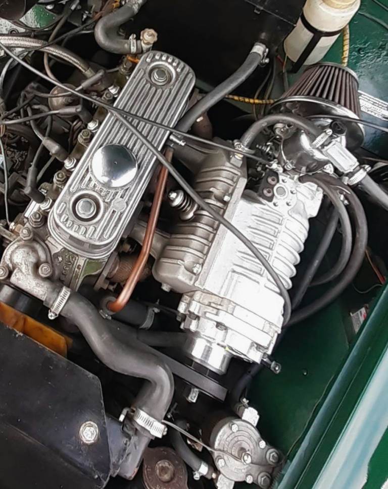 The car has a very solid smooth running engine.correct oil pressure at all times which is essential as it is fitted with A MOSS super charger for *starters. plus the recommended Alternator. Power Brakes. Oil coolers, Electric fan (auto with override that has never needed to kick in even on the hottest days in traffic). Four branch sports straight through exhaust. EDEBRUCK fuel pump, FILTERKING fuel regulator, LUMERTRON magnetic ign and coil .The hood is in excellent condition, a hood cover but no tonneau, as car is fitted with a roll bar. inertial seat belts, sports seats. Fibre glass bonnet. The fuel tank with wing side filler point sits in the boot with regulation firewall if plan racing. Of course add the 100000 miles over its 56 year life with service parts and rebuilt panels.