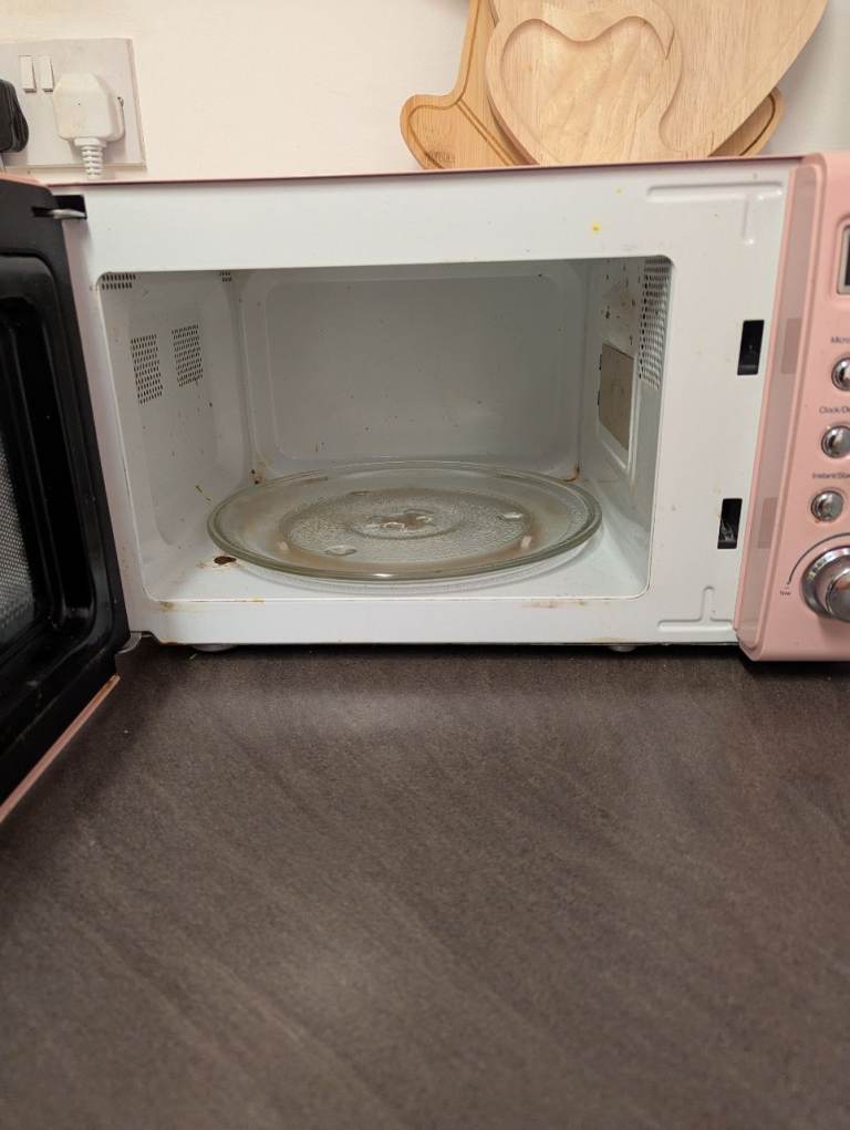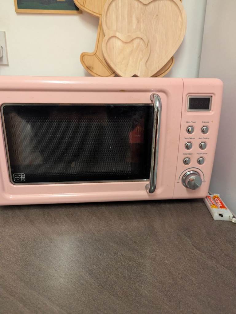 Pink retro style microwave works perfectly, needs new light bulb but doesn't effect the performance, just a bit work hence the price