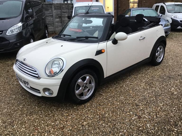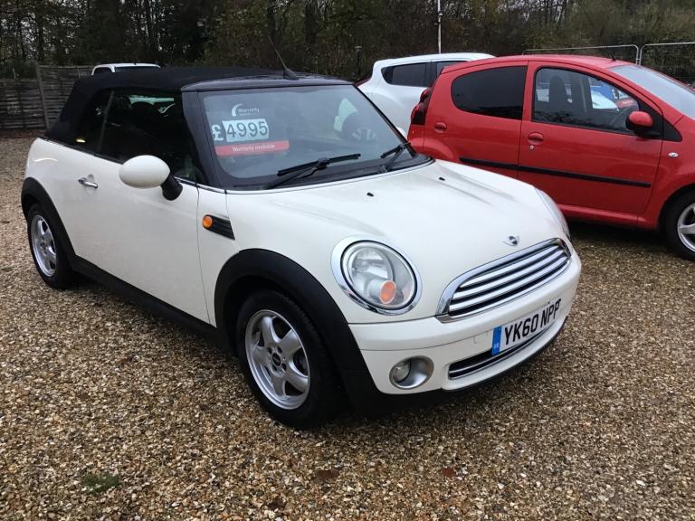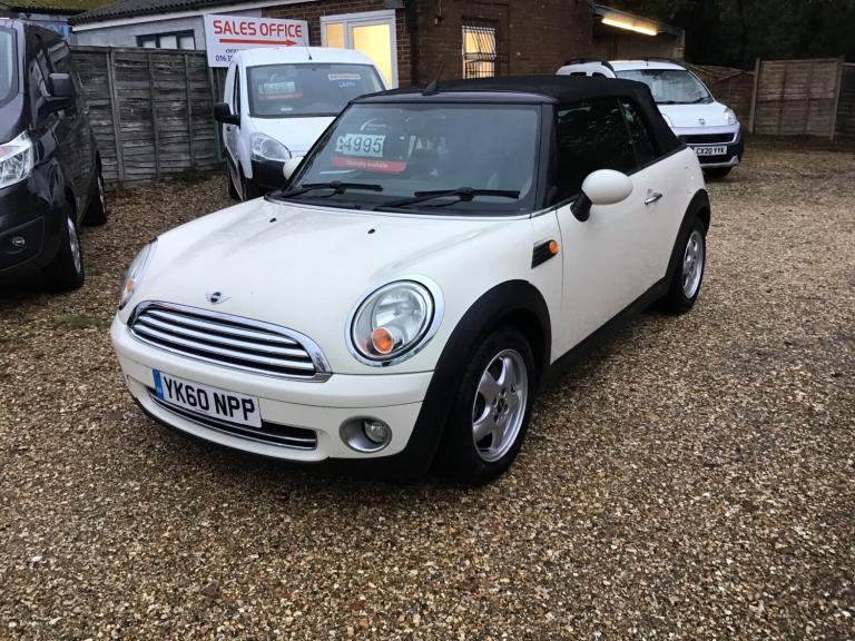 2010/60 MINI COOPER 1.6 CONVERTIBLE WHITE WITH BLACK ELECTRIC HOOD ALLOY WHEELS WITH FOUR NEW TYRES REAR PARKING SENSORS FRONT FOG LAMPS REMOTE CENTRAL LOCKING WITH TWO KEYS BLACK AND CREAM HALF LEATHER INTERIOR HEATED FRONT SEATS RADIO CD BLUETOOTH 6-SPEED ONLY 46309 MILES WITH 5-SERVICES TO 46274 MILES INCLUDING FOUR NEW TYRES MOT 24-11-2026 WITH NO ADVISORY NOTICES SIX MONTHS WARRANTY INCLUDED IN THE SCREEN PRICE JUST £4995 WE EXCEPT BANK TRANSFER OR PAPER MONEY NO CARDS KINGSCLERE SERVICE STATION A339 NEWBURY ROAD KINGSCLERE RG20 4TA WE HAVE BEEN SELLING VEHICLES FROM THIS GARAGE FOR OVER 26-YEARS
