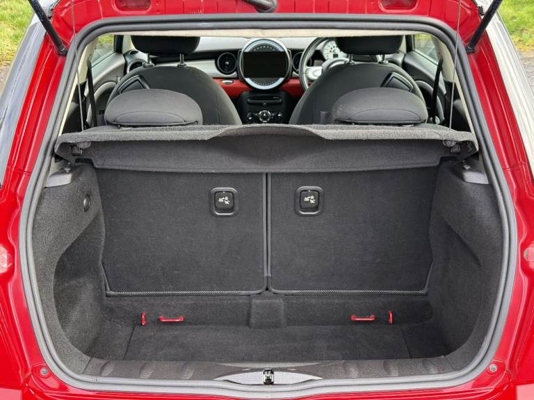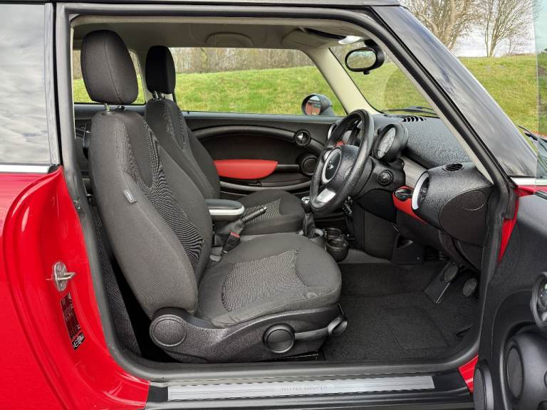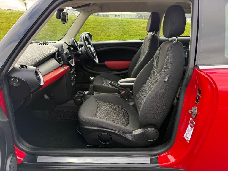 Very clean and shiny Mini Cooper in the classic Chilli red paint with grey cloth interior.