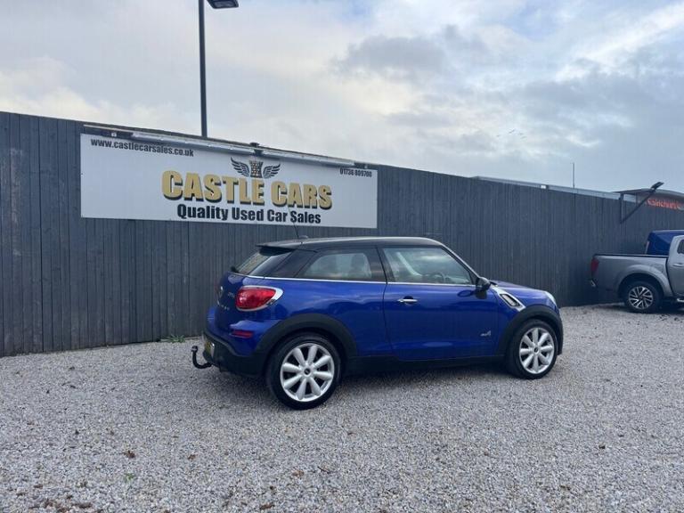 We are pleased to offer for sale this MINI Paceman Cooper S 2013, 1.6 Petrol, 3 Door SUV, 6 Speed ManualStarlight Blue with Contrasting Black Roof, 17"" Alloy Wheels, Towbar, Parking Sensors - Rear, Sports Suspension, Halogen Headlights, and Hill Start Assist 88,181 miles with Good Service History, will be sold with Brand New 12 Months MOT, and is £265 Per Year Road Tax ULEZ Compliant (at the time of writing)This vehicle offers Black Leather Interior with Patterned Inserts and has many features including: Air Conditioning - Manual, Basic Bluetooth Function with USB Audio, Aux-In Connection, Door Mirrors - Electrically Adjustable and Heated, Child Seat ISOFIX Attachment, Cupholders - Front x2, Electric Windows - Front - One Touch Up and Down, and Multi-Function Steering WheelIdeal Small Family VehiclePV Vehicles Considered Accept all Major Credit and Debit Cards 6 Months Warranty Included - Extended Warranty can be Purchased - Please ask for further information **Finance Available (subject to terms and conditions)** Please call Castle Cars - [Phone number removed] or visit [Website URL removed] Alloy Wheels - Turbo Fan Light,Air Conditioning - Automatic,Alloy Wheels in Silver,CHILI Pack,Chrome line Exterior,Chrome line Interior,Dashboard Trim - Piano Black,Door Ellipse and Downtubes - Piano Black,Front fog lights,Headlights - Bi-Xenon,Interior Light Pack,Interior World - Carbon Black,Leather-Hot Cross Cloth - Carbon Black,Multifunction Controls for Steering Wheel,Rain Sensor and Automatic Headlight Activation,Roof and Mirror Caps - Black,Run-Flat Tyres,Seat Heating for Driver and Front Passenger,Starlight Blue, Aux-In Connection, Basic Bluetooth Function with USB Audio, DAB Tuner, Radio BOOST CD, USB Audio Connection, Brake Force Display, Brake Pad Wear Indicator, PDC - Park Distance Control - Rear, Sport Button, TPWS - Tyre Pressure Warning System, 17in Alloy Wheels - 5 Hole Black Star Light, 17in Alloy Wheels - 5-Star Double Spoke Light in Black, Air Scoop Integrated between Bumper and Radiator Grille-Frame in Body Colour, Alloy Wheels in Anthracite, Door Handles - Chrome Plated, Door Mirrors - Electrically Adjustable and Heated, Electric Windows - Front - One Touch Up and Down, Heated Front Windscreen Washer Jets, John Cooper Works Aerodynamic Kit, MINI Mobility System, Mirror Caps in Body Colour, Radiator Grille - Honeycomb-Black with Chrome Surround, Roof in Body Colour, Roof Spoiler Painted in Roof Colour, Security Locking Wheel Bolts, Sills-Bumper Edges-Wheel Arches - Black with Model-Specific Bumper Trims, Spoiler - Roof, White Direction Indicators Lights, 3rd Brake Light, Halogen Lights for Low Beam and High Beam Headlights, Headlight - Beam-Throw Control Electrical with Manual Adjustment, Headlights - Follow Me Home, 3-Spoke Sport Leather Steering Wheel, Air Conditioning - Manual, Bike Rack Preparation at Rear, Centre Rail - Two Part, Colour Line - Carbon Black, Cooled Glovebox, Cupholders - Front x2, Door Ellipse and Downtubes - Dark Anthracite, Door Handles - Interior - Chrome Plated, Door Sill Finishers - Metal Look and Model Dependent Lettering, Foldable Rear Backrest and 50:50 Split, Footrest and Pedals in Stainless Steel, Gearshift and Selector Lever Gaiters in Artificial Leather, Grab Handles, Headlining - Beige, Headrests For All Seats - Manually Adjustable, Interior Lighting Integrated into Centre Front Headliner Above Interior Mirror, Interior Surfaces - Dark Anthracite Decorative Trim Finishers on Centre Console and Door Ring, Lashing Eyes in Luggage Compartment, Luggage Compartment - Light, Microfilter, Non Smoker Package, Seats - Height Adjustable Front, Seats - Height Adjustable Passengers, Seats - Sports Front, Steering Column Height and Length Adjustment, Sun Visors with Integrated Vanity Mirrors on Drivers and Passengers Sides, Electronic Power Steering, Sport Suspension - Lowered 10mm, Airbags - Driver, Airbags - Front Passenger, Airbags - Front Passenger with Deactivation Switch, Airbags - Front Side, Airbags - Head, Alarm - Thatcham CAT1, Anti-Lock Braking System - ABS, CBC - Cornering Brake Control, Central Locking - Activated At 10mph, Central Locking - Remote, Child Seat ISOFIX Attachment, Crash Sensor - Fuel Cut-Off, Crash Sensor - Hazard Warning Flashers and Interior Light, Crash Sensor - Unlocking Doors, DTC - Dynamic Traction Control, Dynamic Stability Control - DSC, EBD - Electronic Brake-Force Distribution, Hill Assist, Personal Profile Functions for Each Remote Key, Second Radio Remote Key