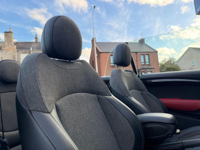 This 2016 MINI Convertible Cooper S boasts a clear vehicle history, offering you peace of mind. Finished in a striking Carbon Black with a Black Pearl Cloth-Leatherette interior, this Cooper S variant features the distinctive MINI Yours Soft Top and 17 inch Tentacle Spoke alloy wheels in silver. The steering wheel comes equipped with multifunction controls, allowing you to easily manage various features.Experience the joy of open top driving with this stylish MINI Convertible. It is powered by a 2.0 litre petrol engine and meets Euro 6 emission standards. This model offers an impressive fuel economy of 47 miles per gallon, placing it in a low insurance group and highlighting its low CO2 emissions, which indicates it is a more economical choice compared to similar vehicles. The Colour Line in Glowing Red adds a touch of individual flair.
