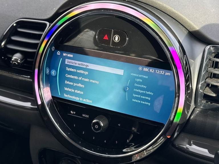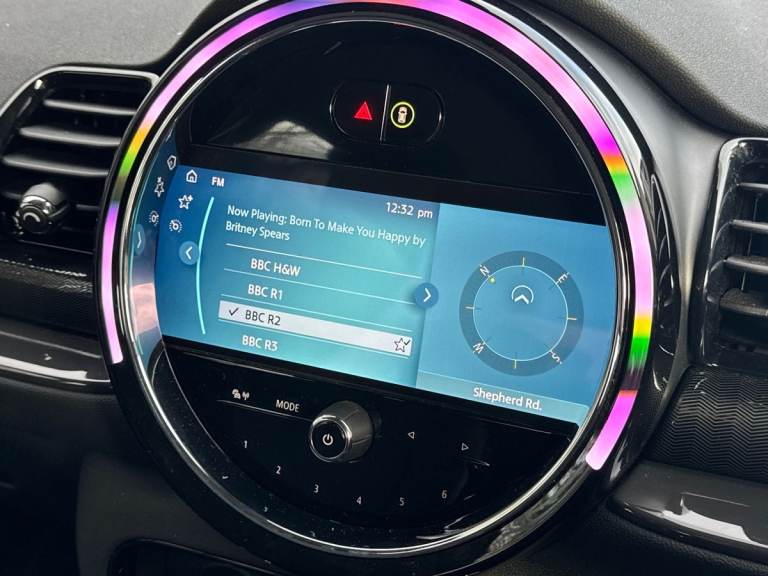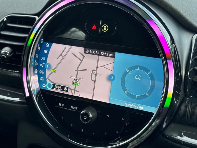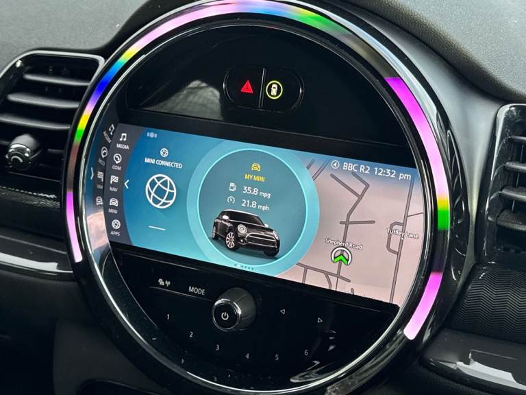 ..Active Guard incl speed limiting and lane departure functions with auto steering, and front collision warning with brake intervention, Automatic start/stop function with brake energy recuperation, Car sharing preparation, Compatible mobile phone bluetooth with audio streaming, Electro-mechanical speed dependant steering assistance, Instrument cluster, Mini E-call, MINI TeleServices, On board computer, Rear parking distance control, 6 Speed manual transmission including gear change indicator display, Double Vanos system, Fully variable valve control, High precision injection, Performance Control, FM tuner and DAB digital radio, Body colour fuel filler cap, Door sill strips, Dynamic brake lights, Electric windows, Exhaust tailpipe, Heated rear window, Heated windscreen washer jets, LED headlights with closed ring as daytime driving lights, LED rear light with union jack design, Left exhaust tailpipe with chrome finisher, Model logo on rear doors, Radiator grille, Rain sensor with auto headlights, Rear fog lights, Rear window wiper, Side scuttle panel with integrated indicator, Split rear doors, Sun/heat protection glass, White indicator lenses, 12V Accessory socket in centre console, 3 spoke sport leather steering wheel, shaped thumb rests+ limiter function and audio controls, 360L luggage compartment capacity, 4 lashing eyes in luggage compartment, 60/40 split folding rear seat, Chrome interior highlights, Cupholders, English handbook, Floor mats, Front and rear head restraints, Glove compartment, Headliner with grab handles and clothes hooks, Height and length steering column adjustment, Interior lighting with 12 basic colours selectable via toggle switch in roof, Isofix rear child seat preparation, Leather gearshift lever and handbrake gaiters, LED reading lights, vanity mirror lights, front foot well light and spotlight on front seats, Manual air conditioning, Manual passenger seat height adjustment, Mechanical seat adjustment, driver seat height adjust, forward/back and front seats backrest, Multifunction steering wheel, Storage compartments in doors, Sunvisors with vanity mirrors, Toolkit, Excitement pack - Clubman, Navigation pack - Clubman, 2 tone horn, 3 point seatbelts on all seats, 6 Airbags - front, side, head and seat belt tensioners, Anti-lock braking system (ABS), DSC - Dynamic Stability Control, Electronic handbrake, Front and rear disc brakes, Tyre pressure monitoring system, Alarm system with tilt sensor, monitoring doors, bonnet
