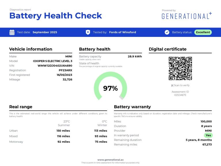 This 2023 MINI Electric Hatch Cooper SE Level 3 has had only one owner from new, offering a pristine example of electric motoring. As an all electric vehicle, it boasts a 33 kWh battery with a maximum range of 142 miles when new. Charging is convenient, with a full charge at home taking approximately 5 hours and 15 minutes using a 7kW charger, while rapid public charging can achieve 80% capacity in just 36 minutes. This Level 3 trim comes equipped with a Rear View Camera for enhanced parking assistance and the Comfort Access System for keyless entry, making every journey smoother. The MOT is valid until May 2026, providing peace of mind. Experience the spirited performance of this MINI Electric Hatch, which accelerates from 0 to 62mph in a swift 7.3 seconds. This impressive acceleration highlights its capability, offering a more engaging driving experience compared to many other electric vehicles in its class. The combination of its efficient electric powertrain, user friendly charging options, and desirable features like keyless entry and a rear view camera, makes this Cooper SE Level 3 a compelling choice for those seeking a stylish and practical electric car. Welcome to the award winning FOW Car Supermarket. Were the largest and most trusted Car Supermarket in the North West with two convenient locations in Winsford, Cheshire and Trafford, Manchester. With over 60 years of experience, were proud to offer award winning customer service and great prices alongside one of t...