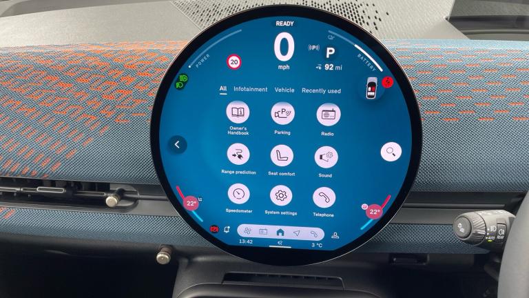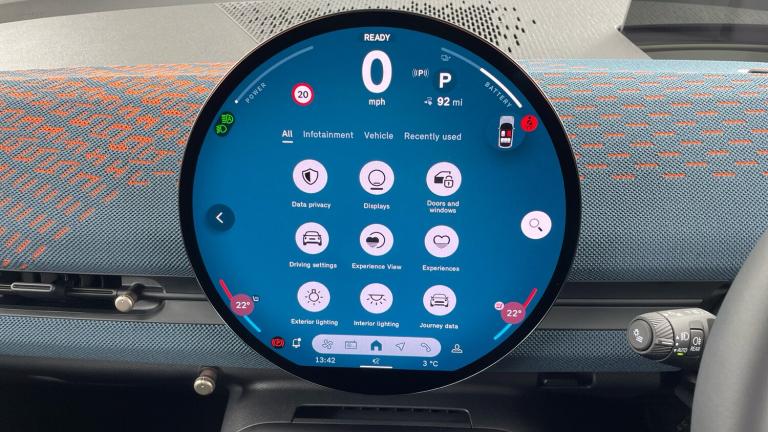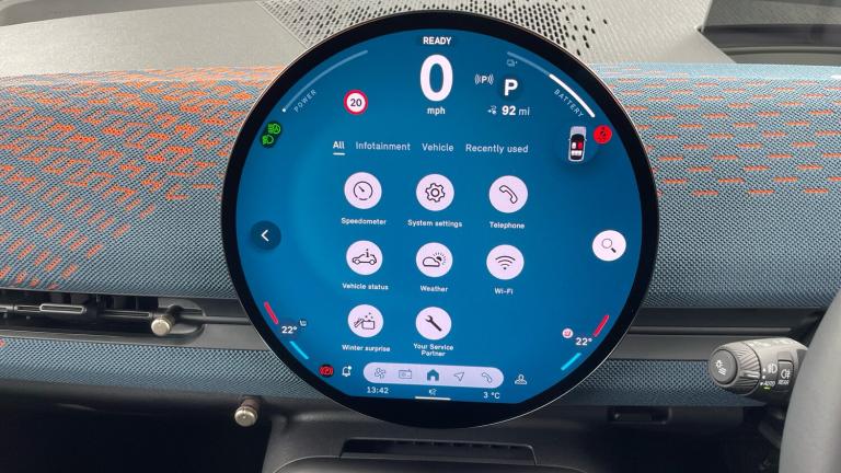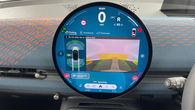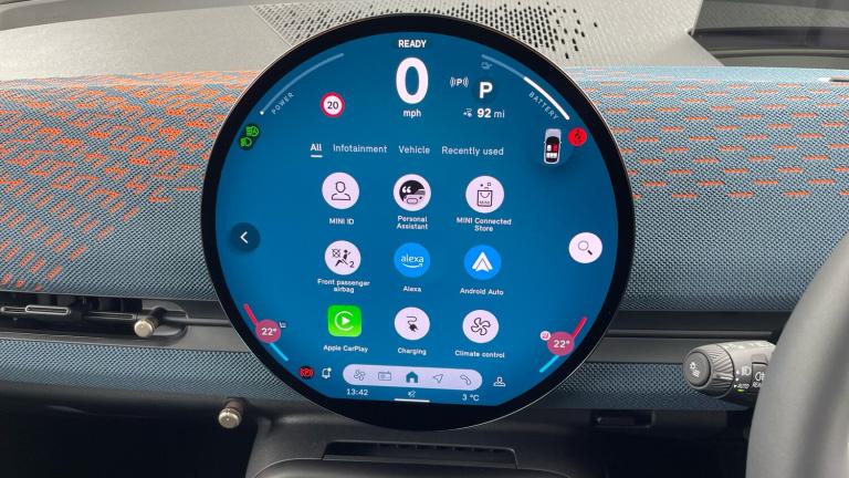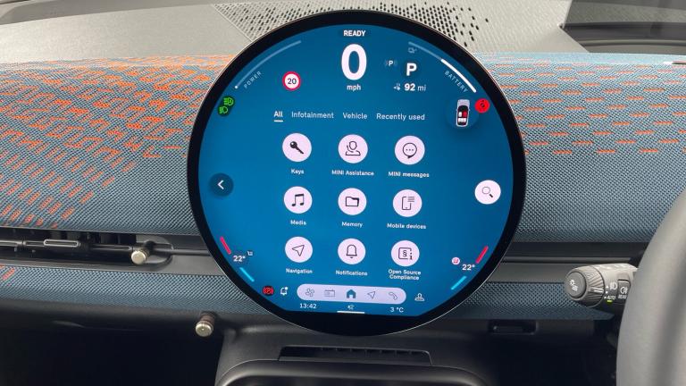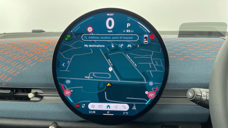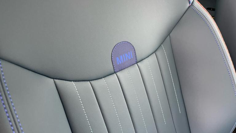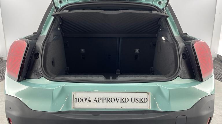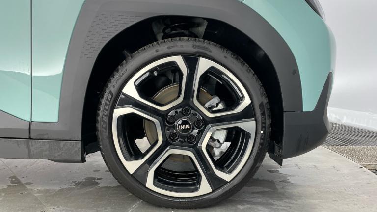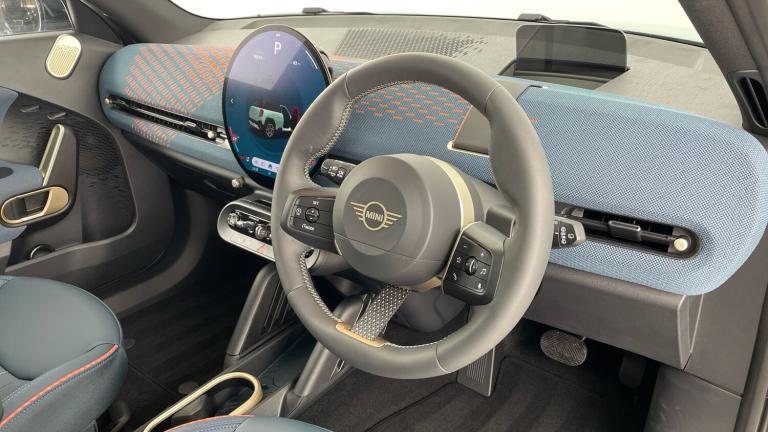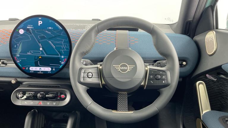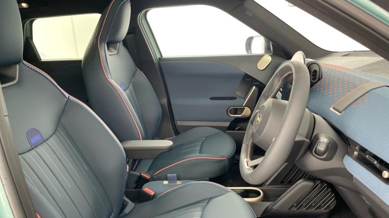 .Floor mats, DC Rapid charging, 11kW AC charging, Electric front+rear windows, Heated rear window, Heated windscreen washer jets, Rear window wiper, Rain sensor window wipers, Traction control, DSC - Dynamic Stability Control, Electronic parking brake, Anti-lock Braking System (ABS), Front and rear disc brakes, Cruise control, Rear view camera, Driving assistant, Electro-mechanical speed dependant steering assistance, Parking assistant, MINI Experience Modes, Driver camera system, On board computer, Service interval indicator, Emergency call service, Mini navigation system, Circular OLED Screen, Intelligent Personal Assistant, MINI operating system 9, Electric adjustable heated door mirrors, Blue decorative dash strap, Petrol dash knit with patterne orange, Mode 3 cable, DAB Digital radio, Personal eSim, Roof rails, Rear side wing doors, Vibrant silver grille surround, Logos in Vibrant Silver, Third brake light, LED daytime running lights