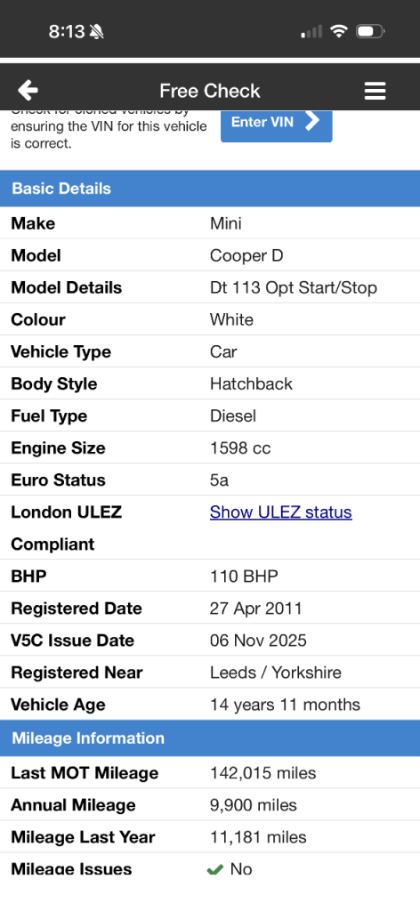 Hi for sale my lovely 2011 Mini Cooper D Start/Stop 1.6 diesel with 142k on the clock and MOT till 14th September 2026.