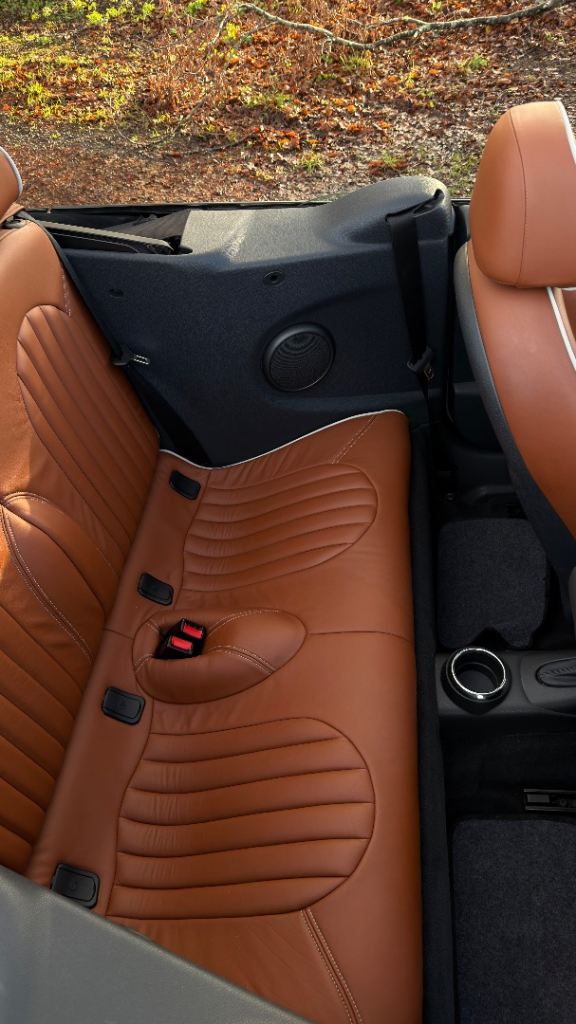 Excellent condition, lovely tan coloured leather upholstery with cream trim. original mini sidewalk Wheels have been powder coated gloss black.