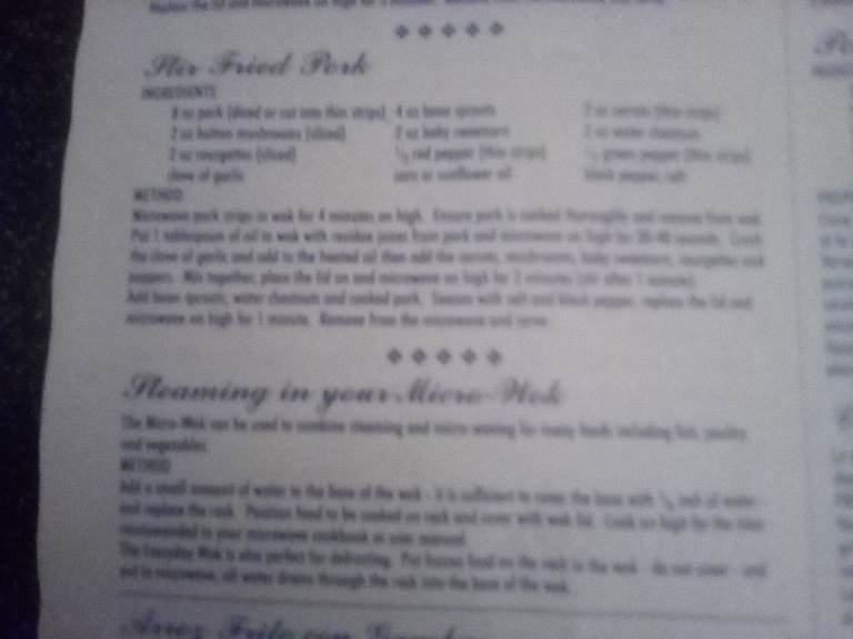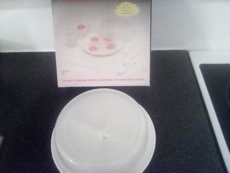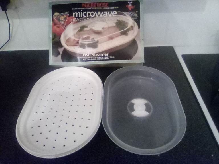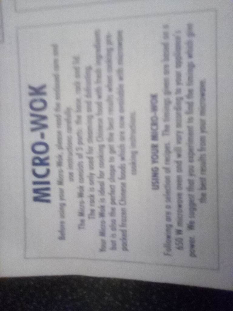* Micro-wok - comprises 3 parts - the base, rack and lid. Ideal for cooking Chinese food but also with the rack for steaming and microwaving many foods including poultry, fish and vegetables. Also ideal for defrosting. Cost £16 sell of £8.