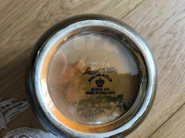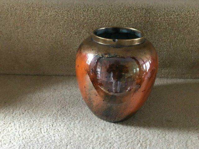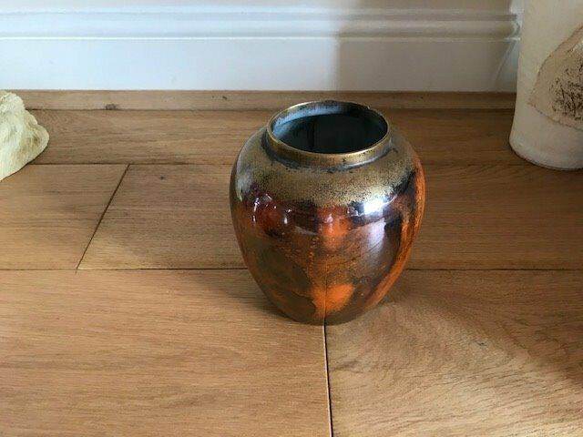 An orange marble effect Losol Ware ceramic vase with gilded rim-marked Keeling and Co.,Burslem Has a tiny imperfection on the inside of its rim which is hardly noticeable-it is 6ins tall