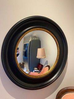 Set of two black round convex mirrors with gold trim. Sold as a pair. Decorative and practical, ideal for hallways, living rooms, or feature walls. Wall mounted. Very good condition.