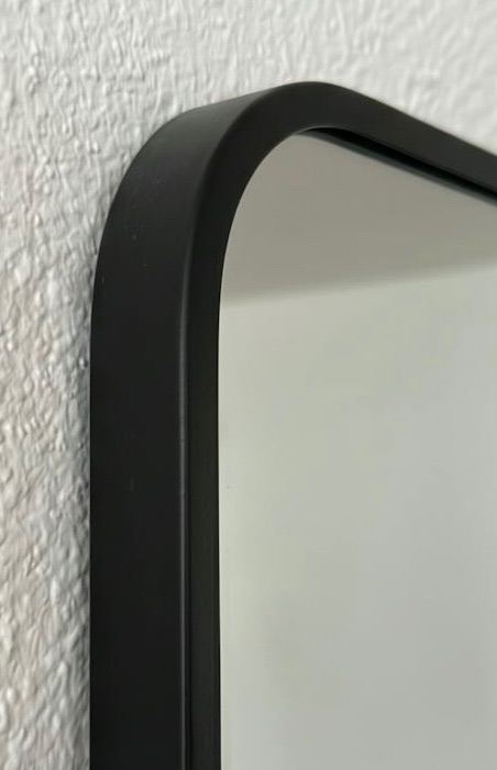 Stylish rectangular mirror with a sleek black frame and rounded corners.