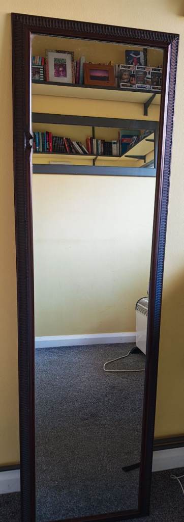 Beautiful full-length mirror with a rich dark wood frame, perfect for a bedroom, hallway, or dressing area. The frame has a classic carved design that adds character and warmth to any space.