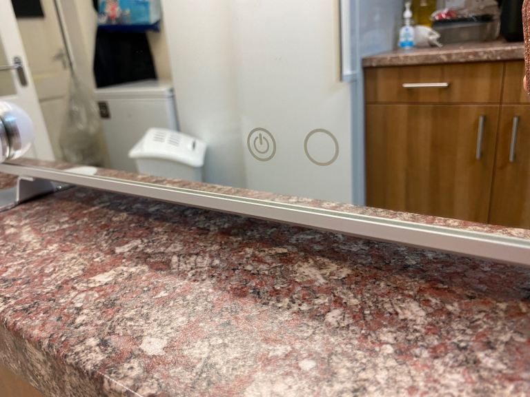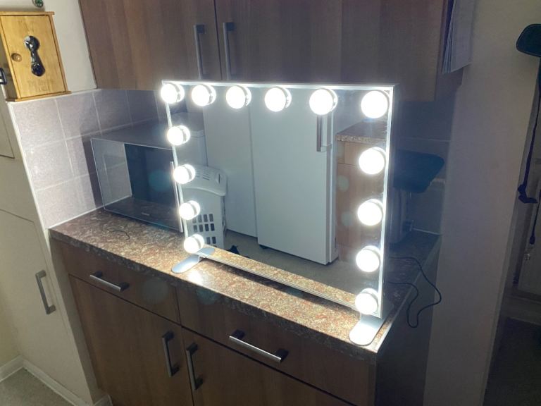 Hollywood LED light up mirror has 2 touch buttons for dimmer and on/off has the stand or can be wall mounted has plug and booklet hardly been used