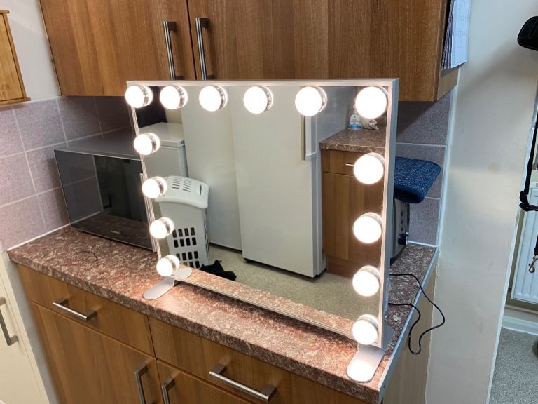 Hollywood LED light up mirror can be on stand or wall mounted has 2 touch button for dim and colour change hardly used has instruction booklet