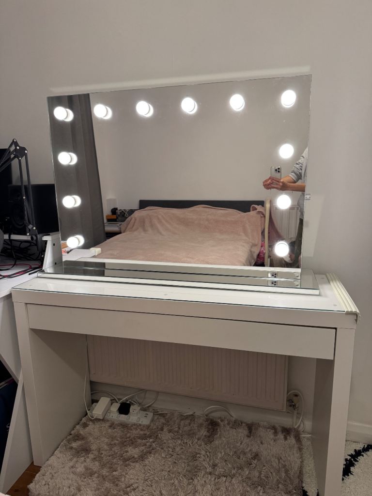 Classic Hollywood mirror (MALM IKEA vanity table included) , table top stand or wall mount. High quality studio lighting for easy make up application. mirror includes 12 x 3 Watt fixed tri colour LED bulbs. This mirror has been designed with an edge-to-edge front to give you the maximum mirror size possible. Dimensions: Height 70cm x Width 100cm x Depth 6cm. I am selling both items together as a set as it goes perfectly together.