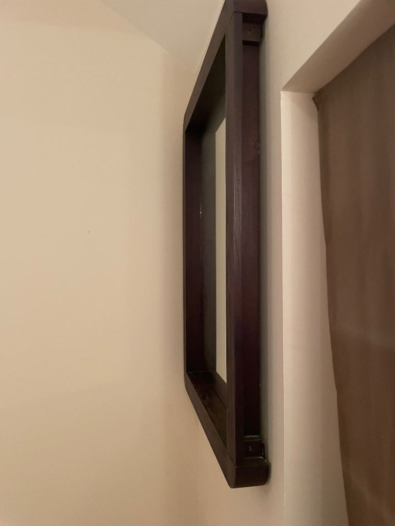 Dark wood large mirror can be hung landscape or portrait. Very heavy.