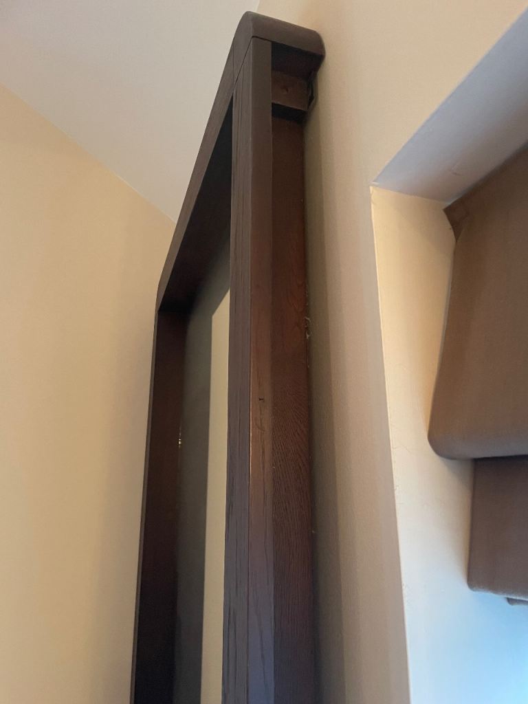 Dark wood large mirror can be hung landscape or portrait.