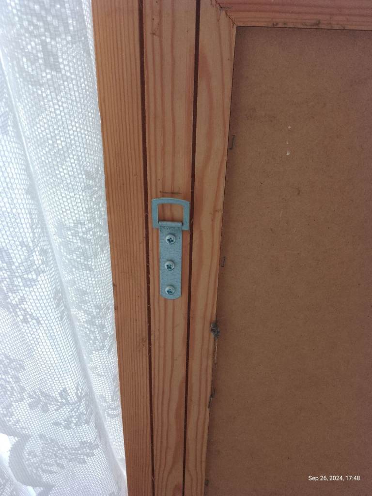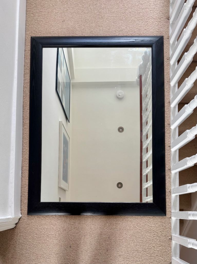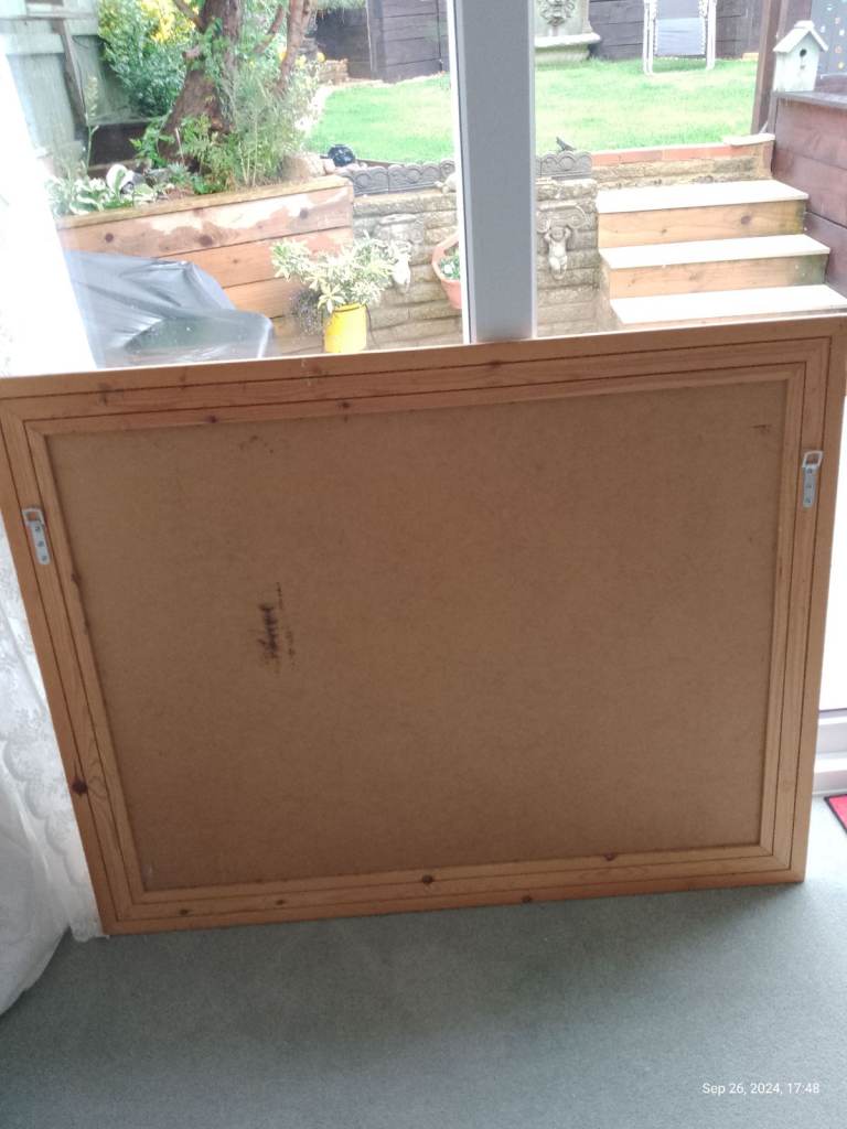 Large mirror. Frame could be painted to match your colours. Lovely large rustic wooden framed mirror. 120cm x 92cm. Good strong hanging fixtures. Excellent focal point hung above a mantelpiece or in hallway to reflect light.