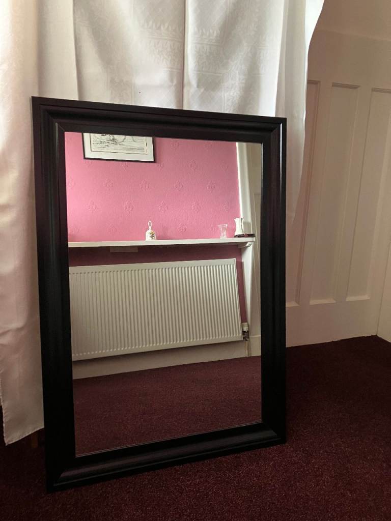 Large mirror framed in wood. In excellent condition. Measures 106cm x 75cm. Hanging wire intact and secure in frame. Buyer collects. State in email when you can pick up and no time wasters please.