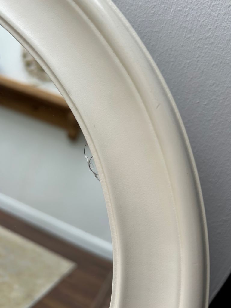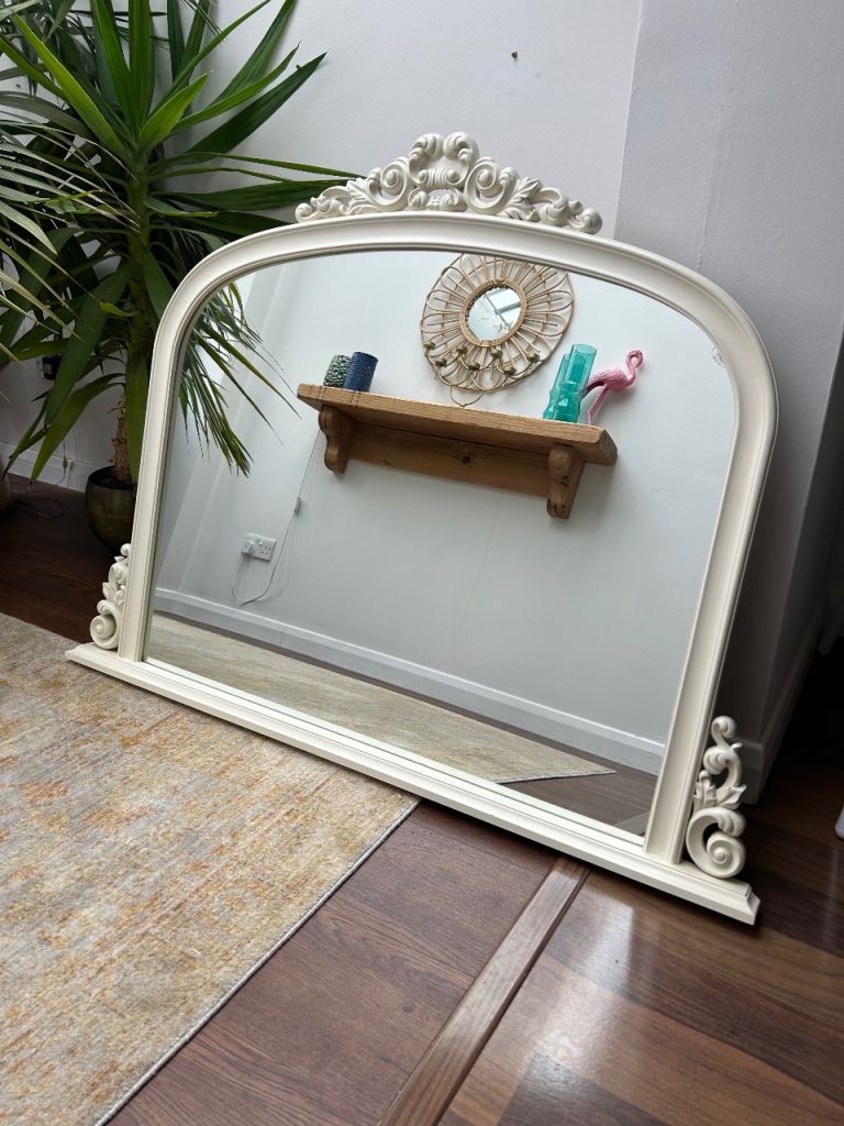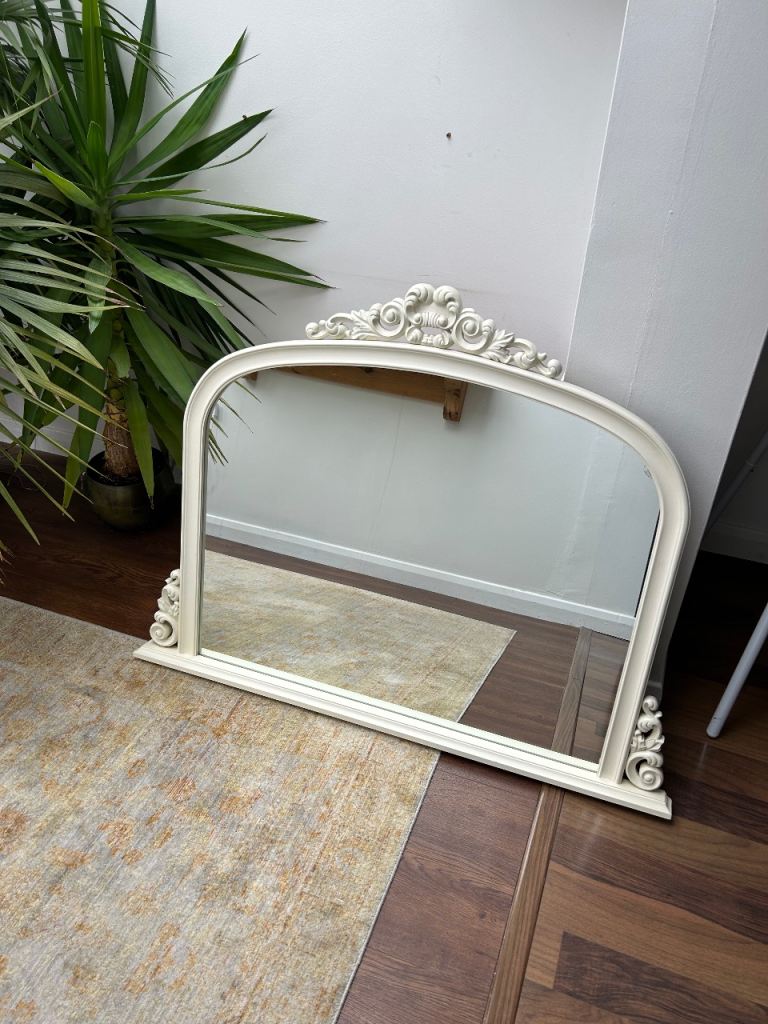 Large cream overmantel mirror. Slight damage to glass top right corner as shown. Dimensions at largest points: width 46”, height 35”, depth 2”.