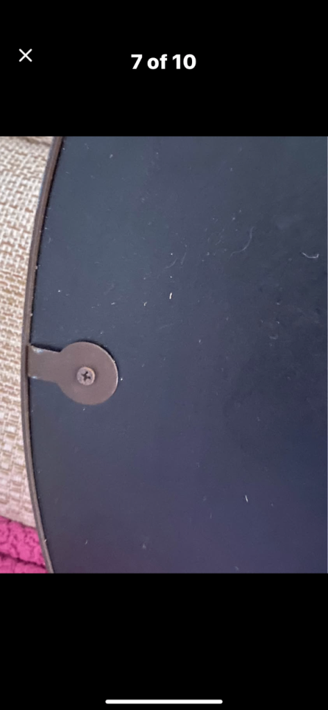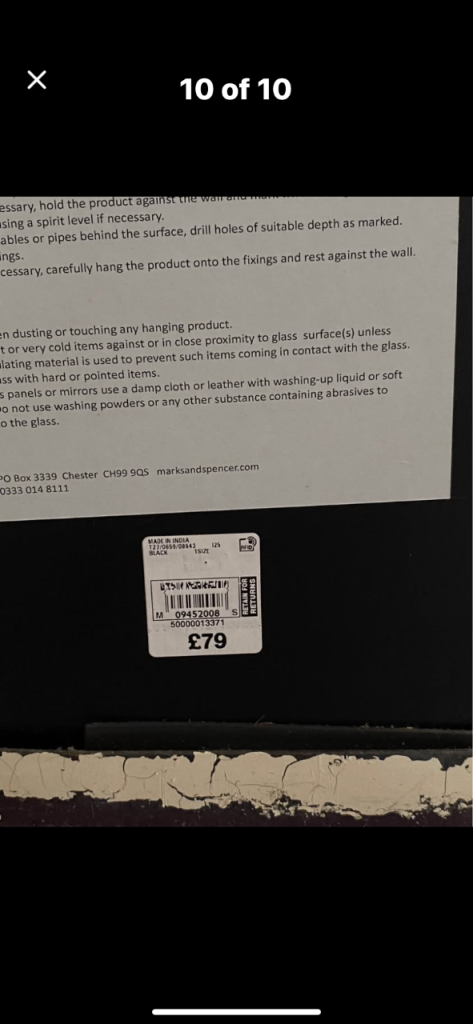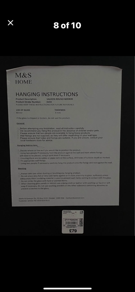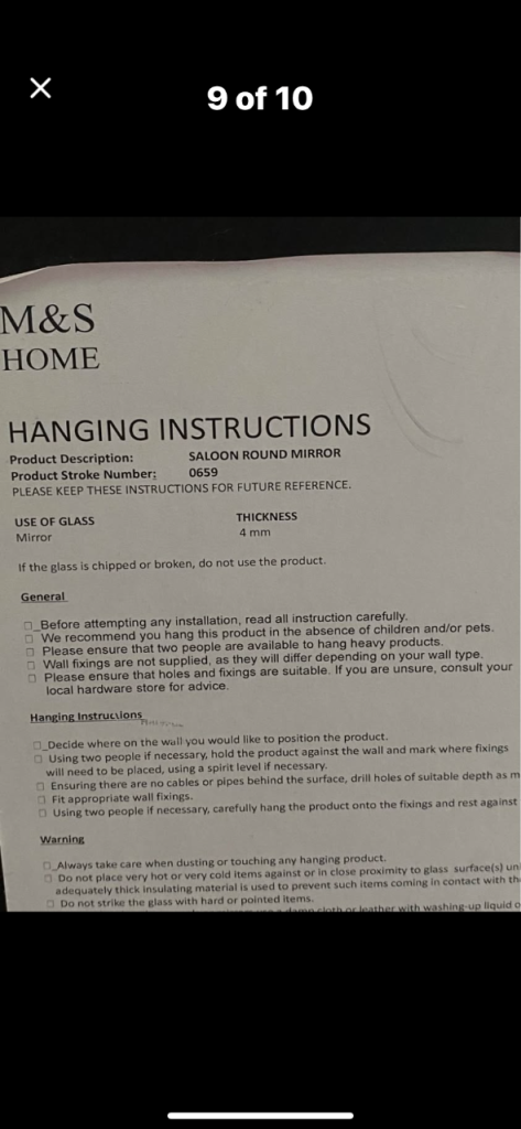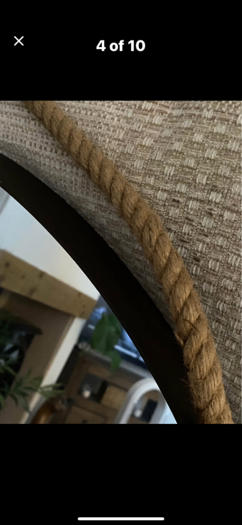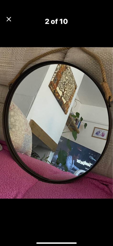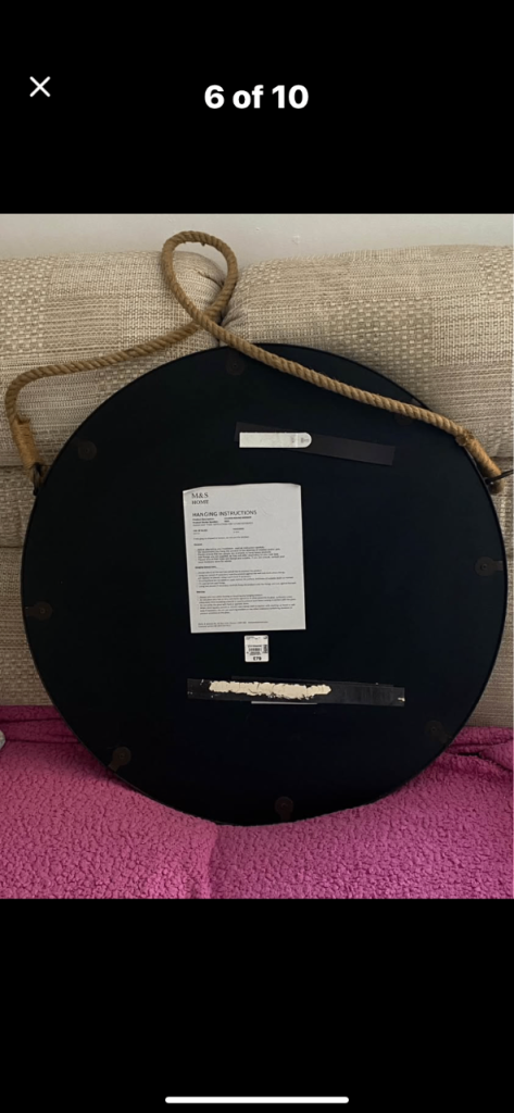 M & S Large round mirror . Rope attached either side. The rope is looped in the photos but it can unloop too. Dark brown surround which looks like metal. Hanging instructions on the back . Back has Velcro fixing which was put on before realising it probably wasn’t the best idea due to the weight ! Originally £79.