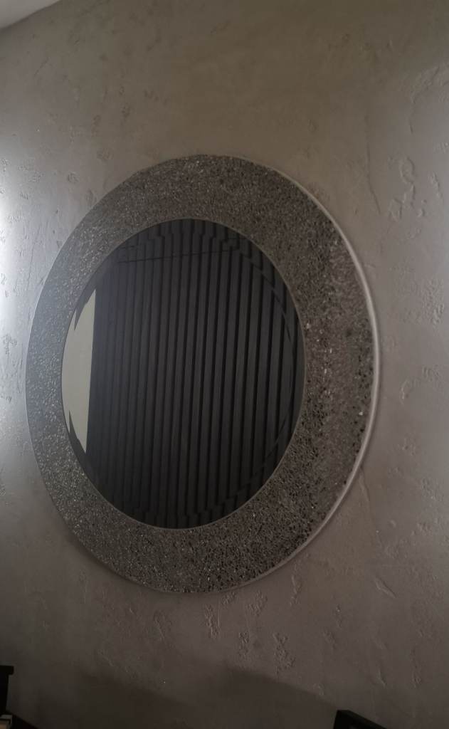 Beautiful and elegant round wall mirror in silver color with a decorative mosaic frame.