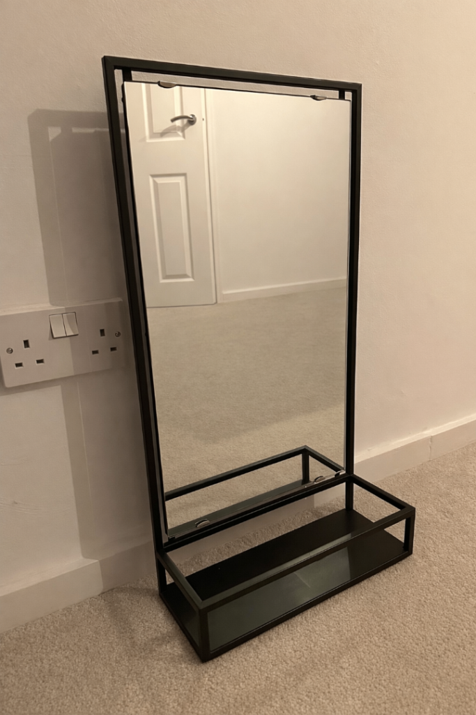 Large mirror with a rustic wooden frame. The bottom of the frame also acts a shelf.