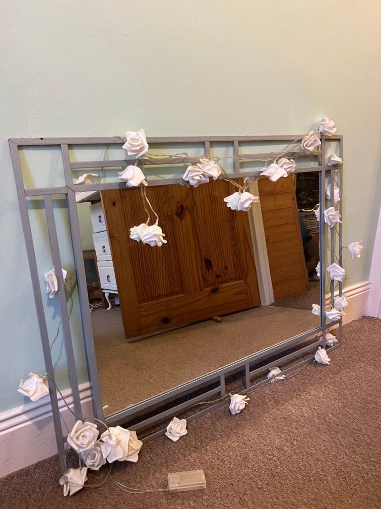 Large metal framed mirror in great condition. Optional flower lights (batteries not included)