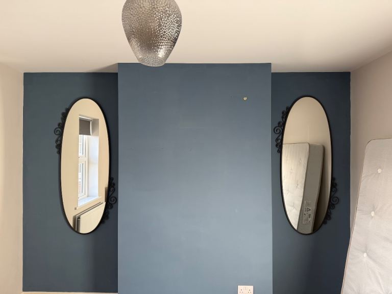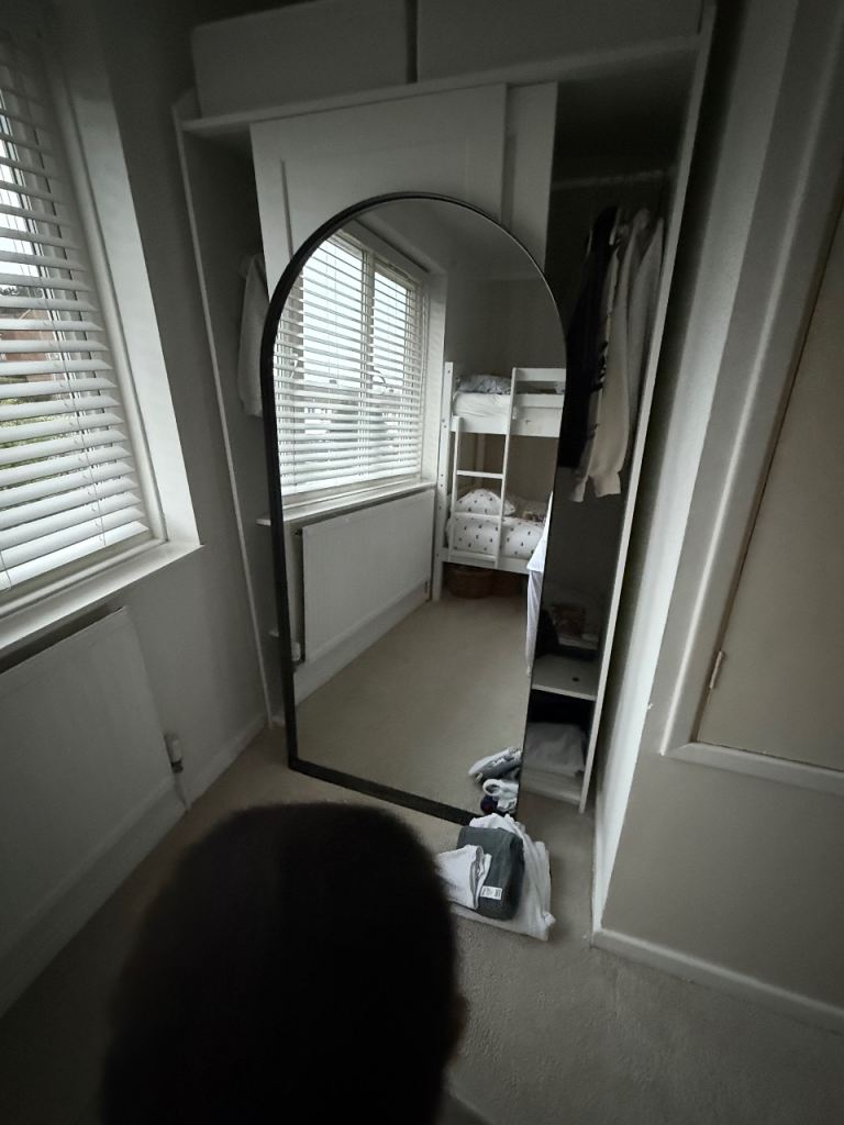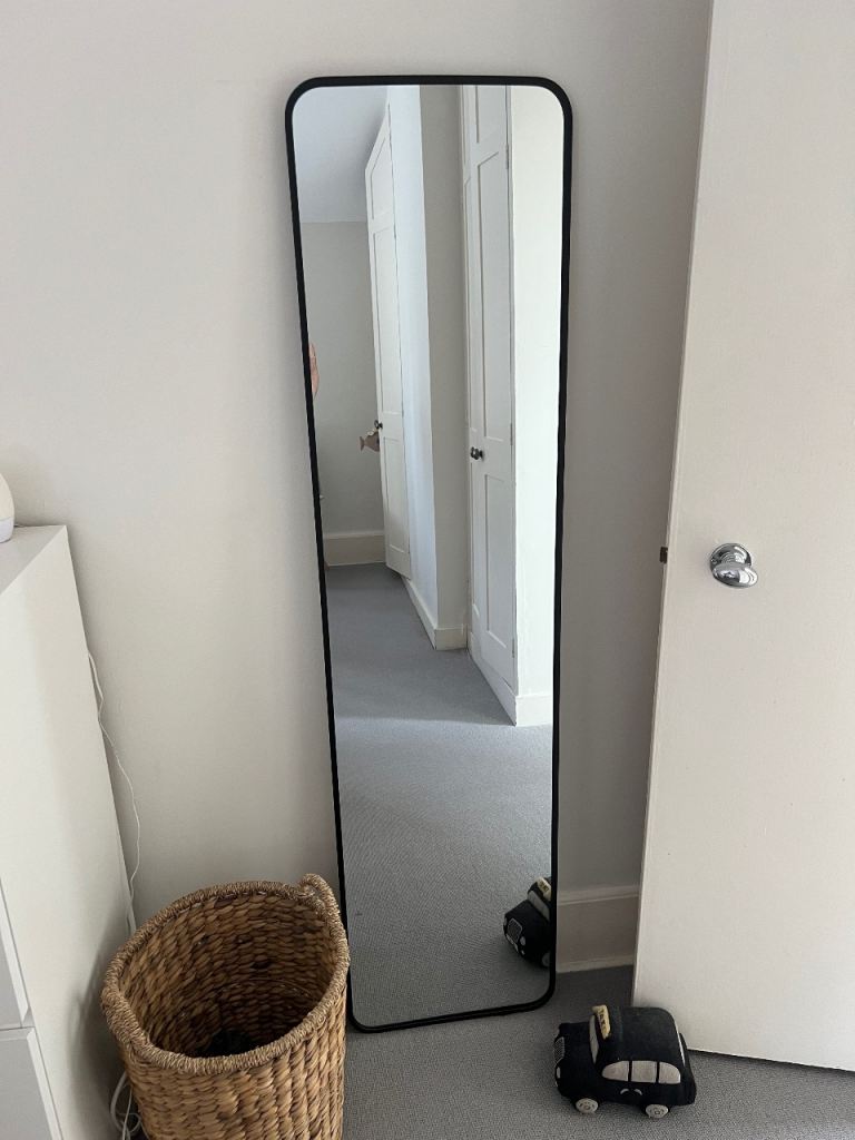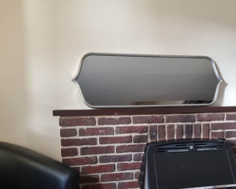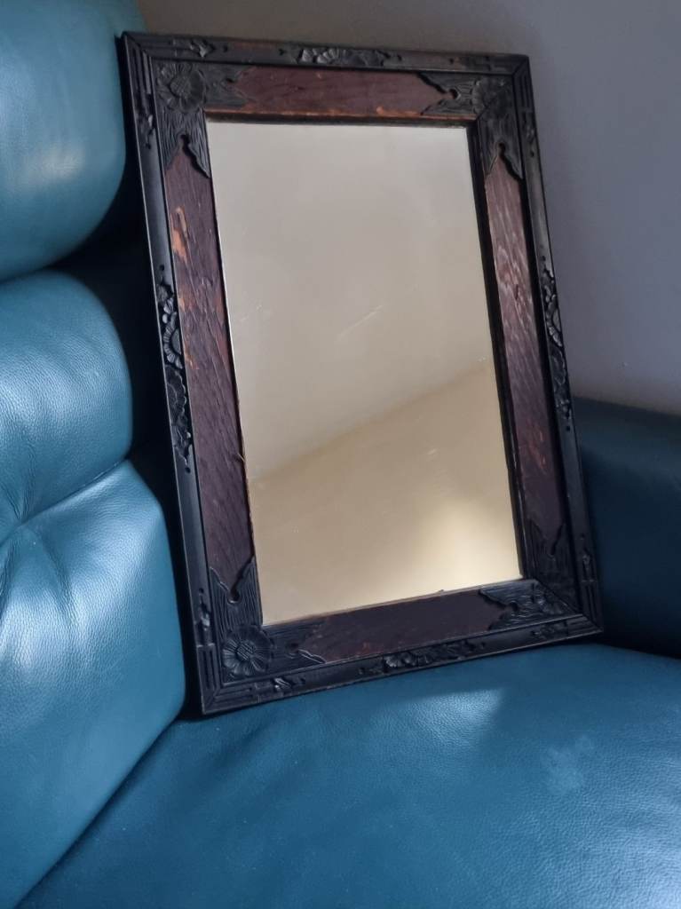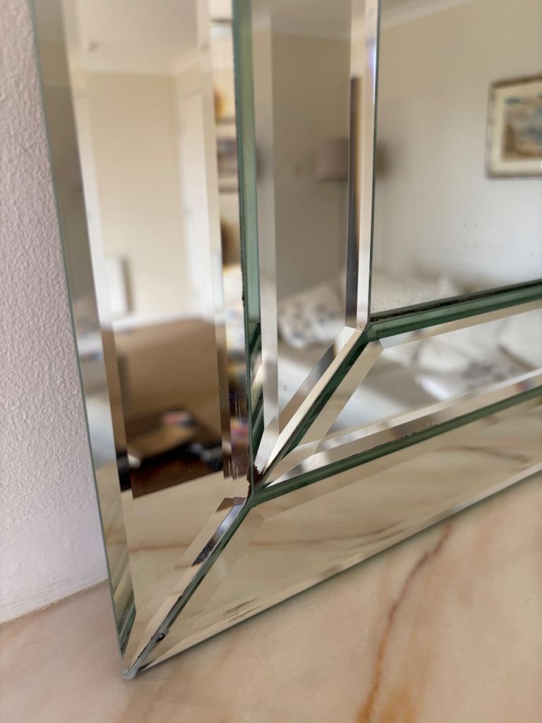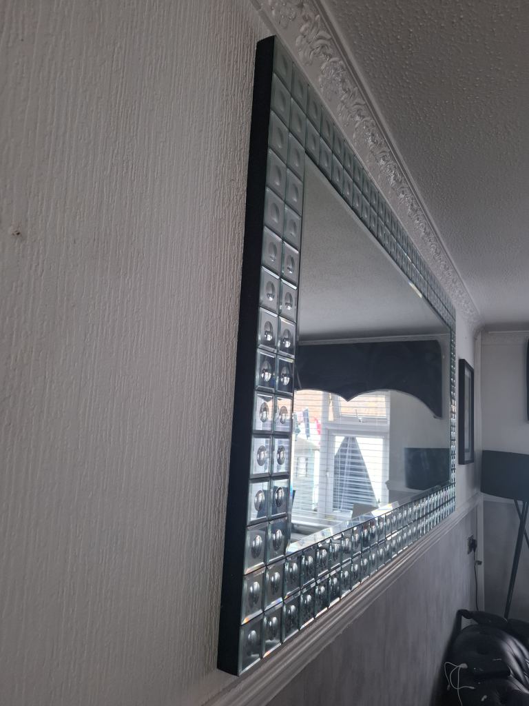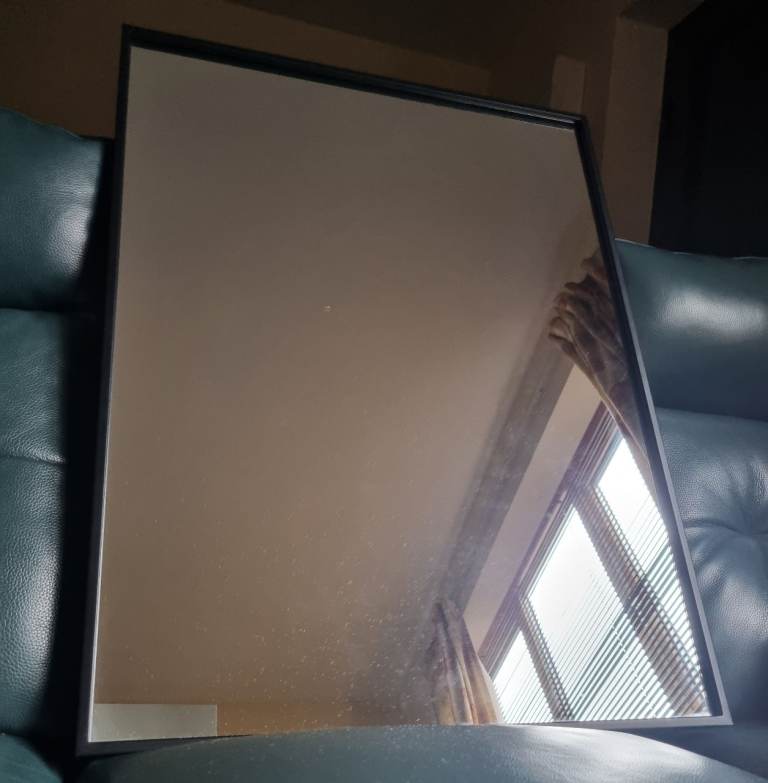 Large, solid, double bevelled mirror with black felt backing. It can be hung in Landscape and Portrait positions. There are tiny blemishes on 2 of the corners,hardly noticeable when hanging on the wall. Size: 106 cms x 74 cms or 41 inches x 29 inches. To be collected or by arrangement, can be delivered up to a distance of 10 miles.