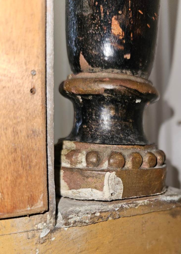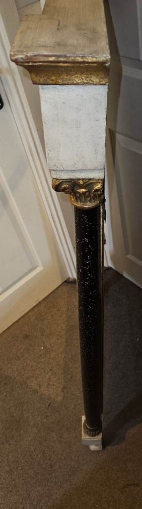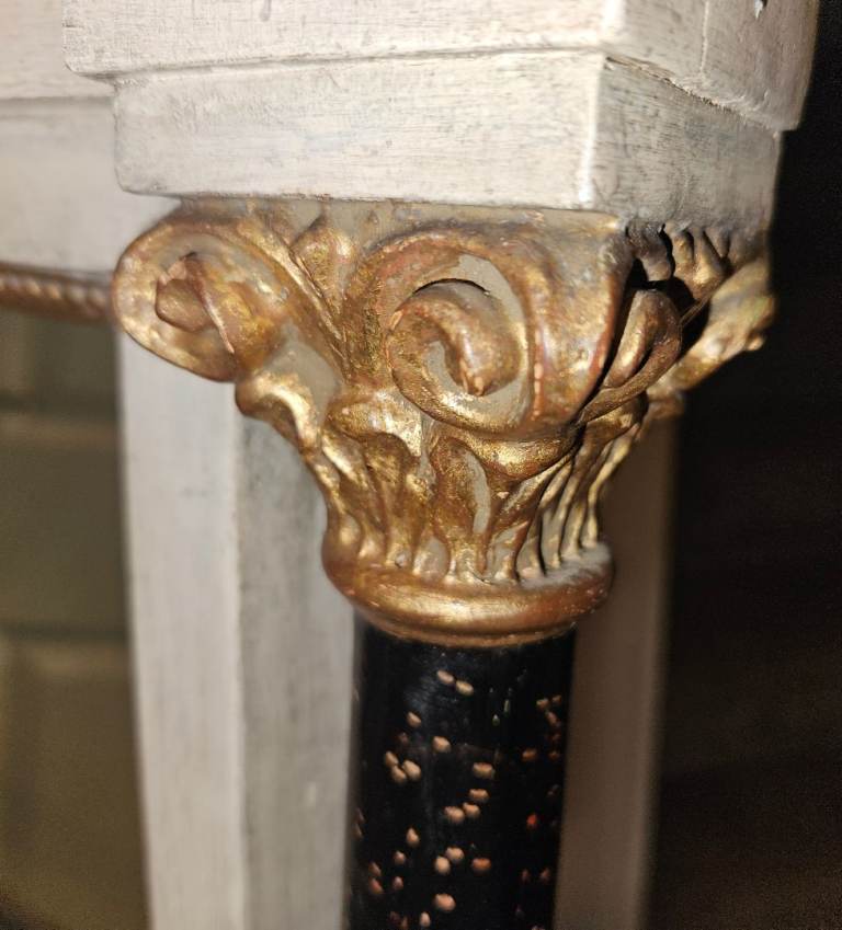 This unique Italian Venetian mirror is a true work of art, combining refined neoclassical design with exquisite decorative details. The frame is finished in a warm crème painted tone with gilt accents, evoking the elegance of 19th-century Venetian craftsmanship. Flanking the mirror are sleek black speckled columns topped with gilt capitals, adding contrast and architectural balance.