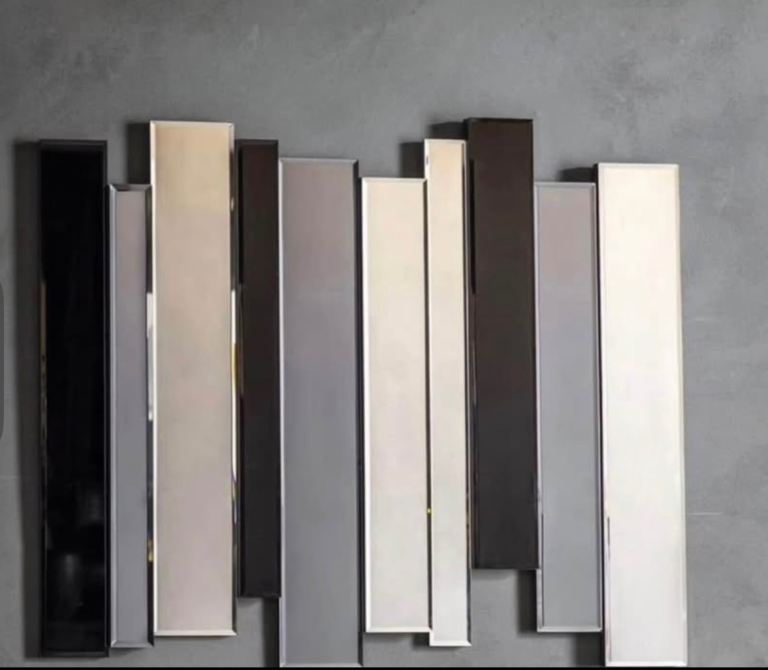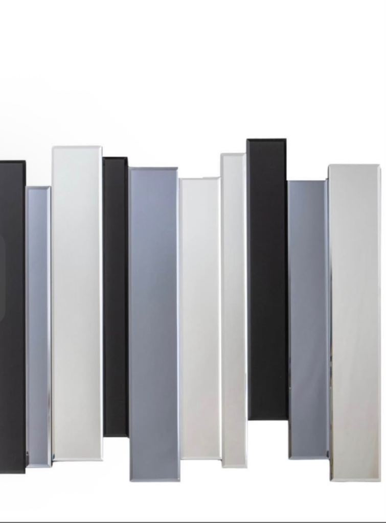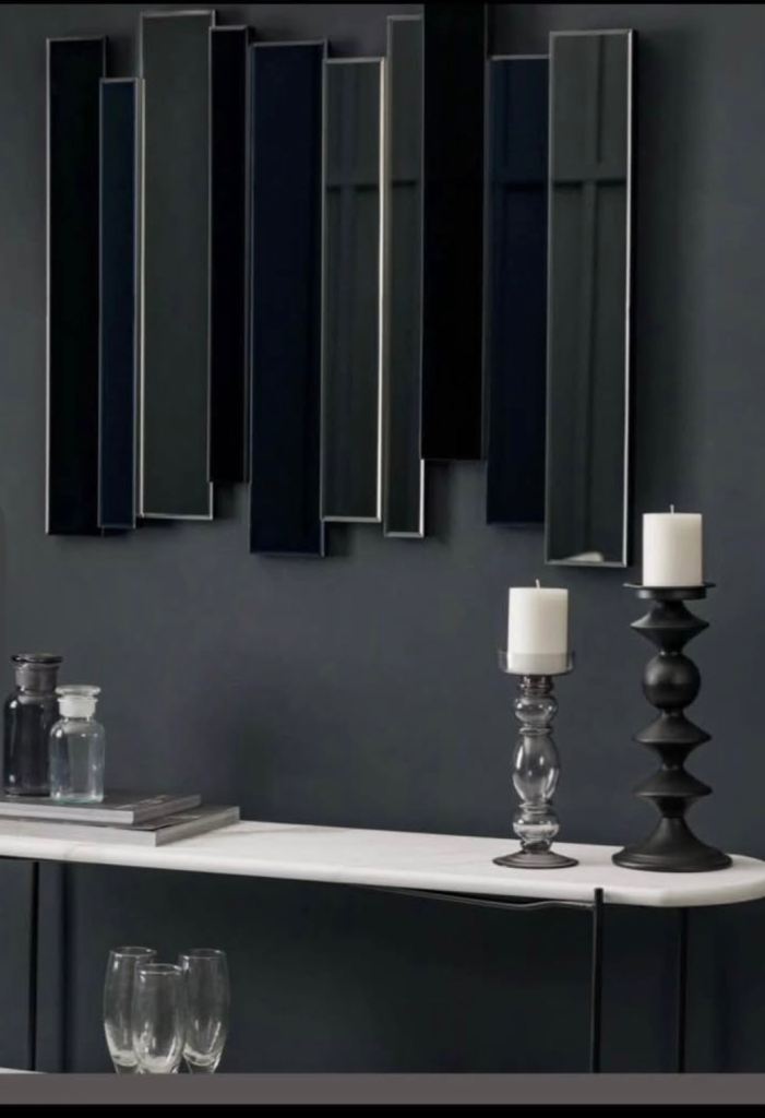 Decorative wall mirror featuring a series of mirrored panels, in clear, smoked and black glass.