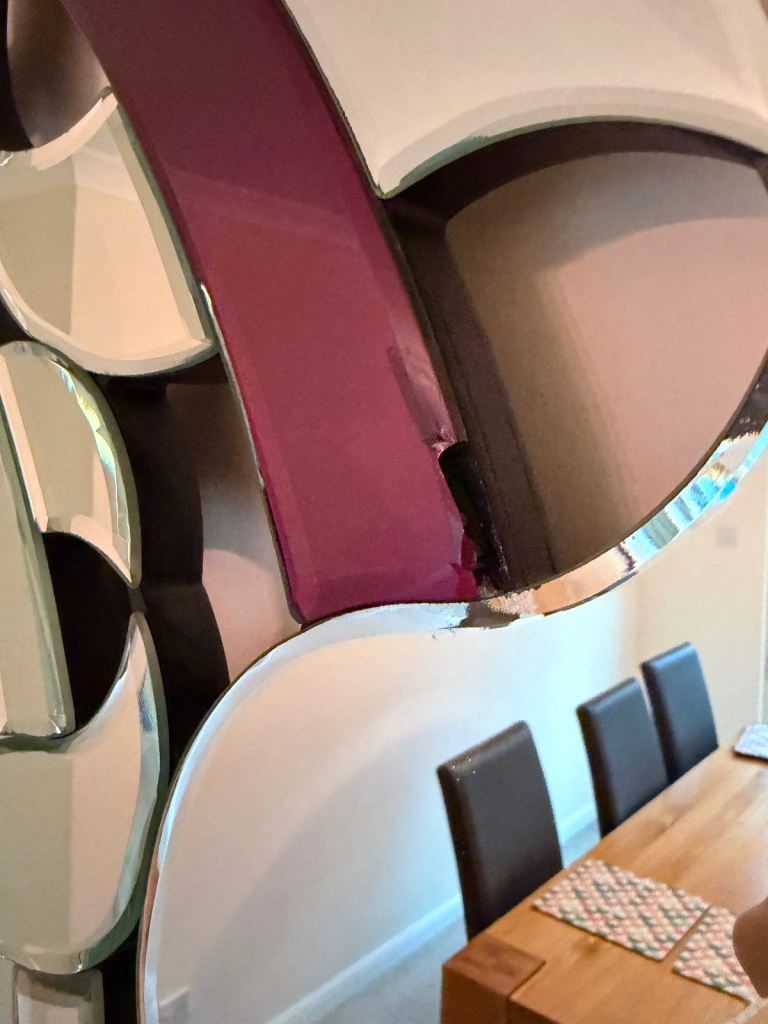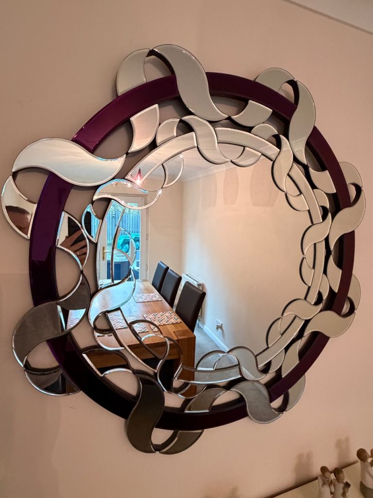 Rik purple and clear ribbon style wall mirror, has a slight crack on one side. Not noticeable when up. It was damaged in transit and we have never noticed it when on the wall. Low price because of this