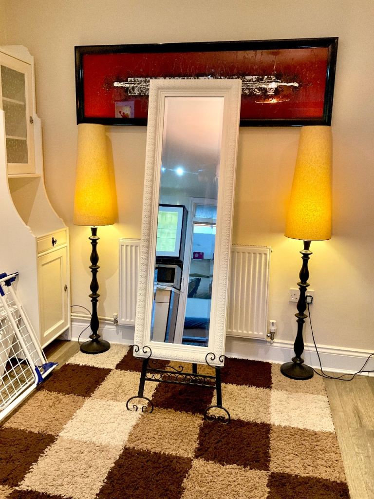 Round mirror, no backing, could be mounted or framed, nice thin light design. Accurate picture.