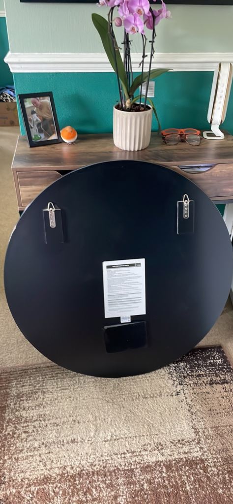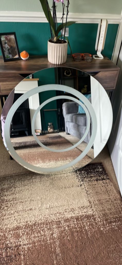 The round mirror features a concentric ring design and is ready to hang.