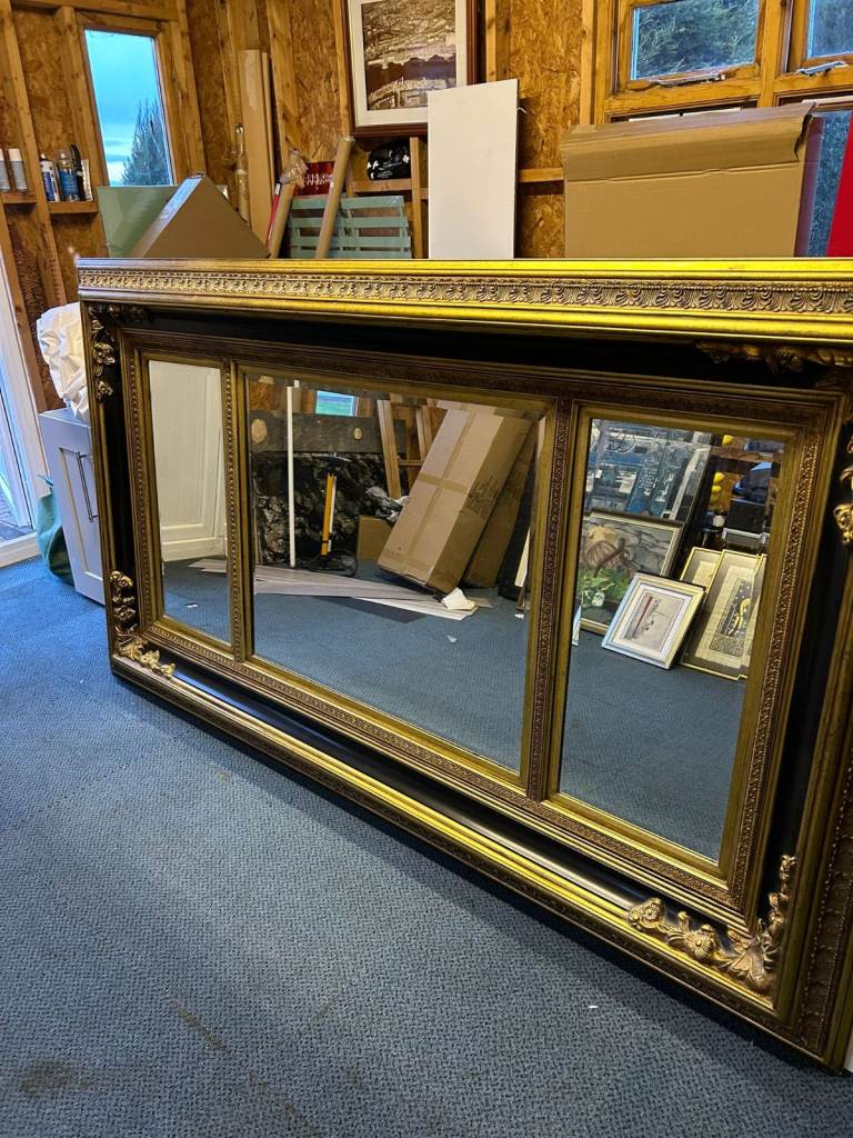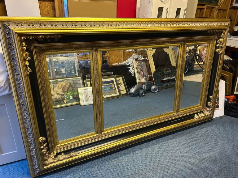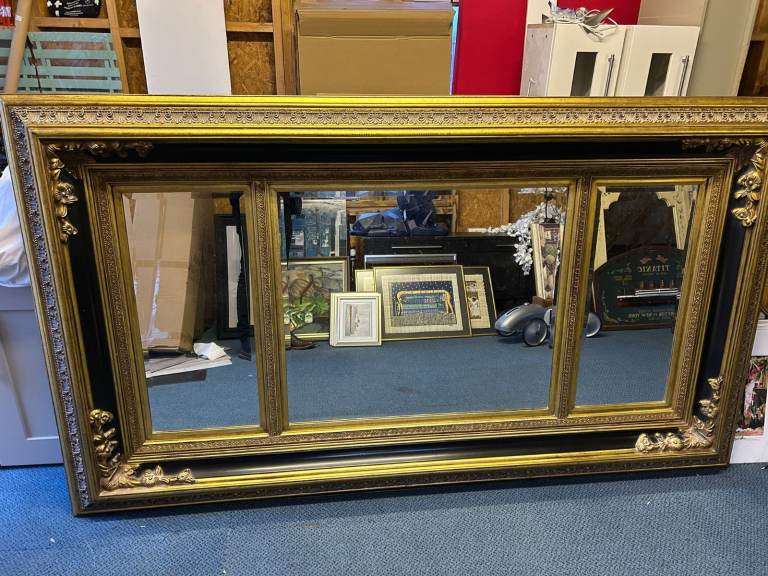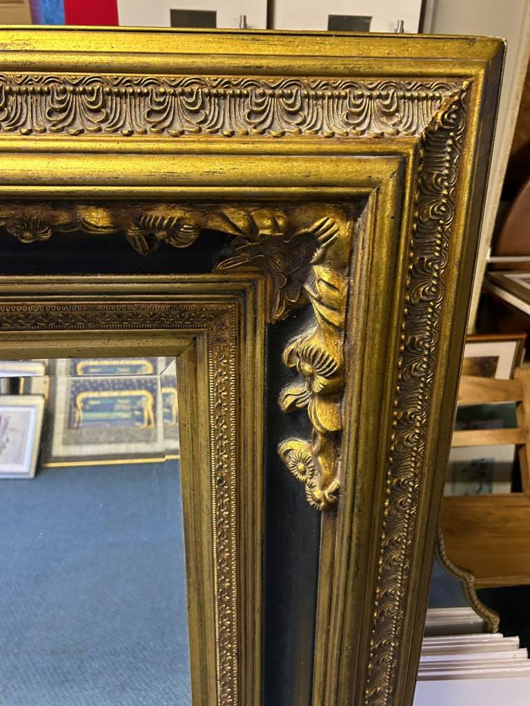 VERY LARGE BLACK & GOLD GILT DECORATIVE CARVED WALL MIRROR