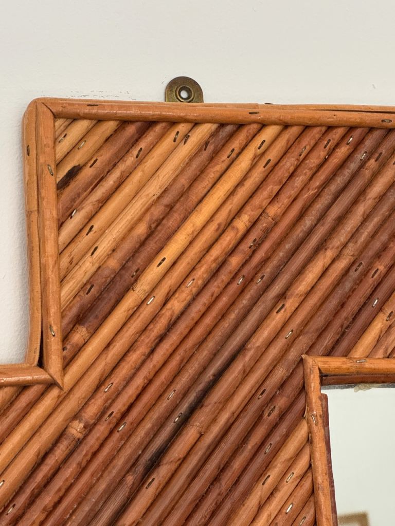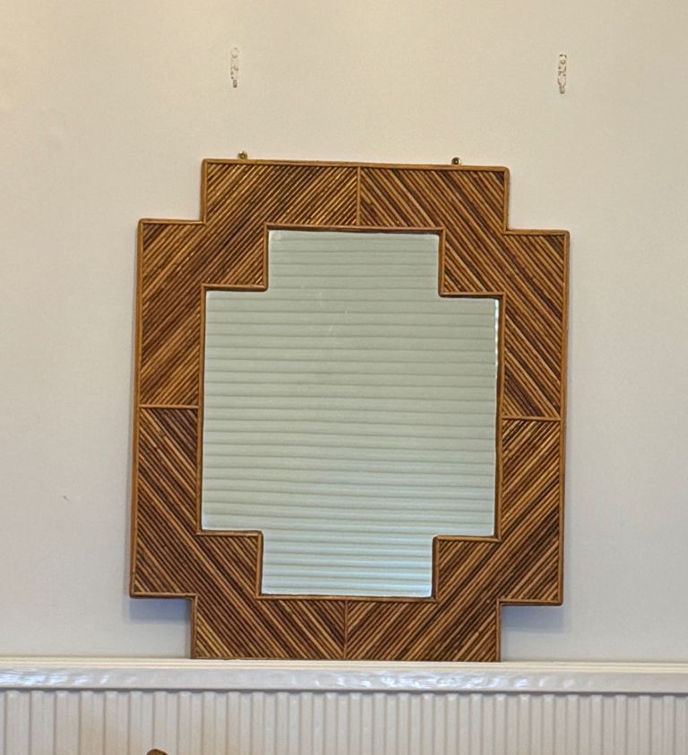 Distinctive wood/bamboo mirror 28”x33” (71cms x 84 “). Unusual shape in excellent condition, one very small piece missing on corner , not really noticeable. Four fixings for firm attachment to wall . Open to discussions