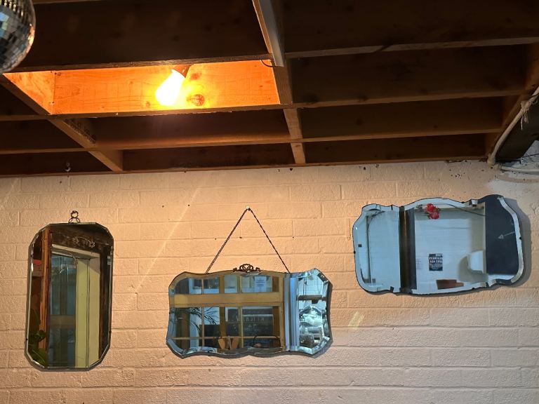 Posting for 3+ yearsVintage Art Deco Frameless Wall Mirror with Scalloped Edge And Flower On Top