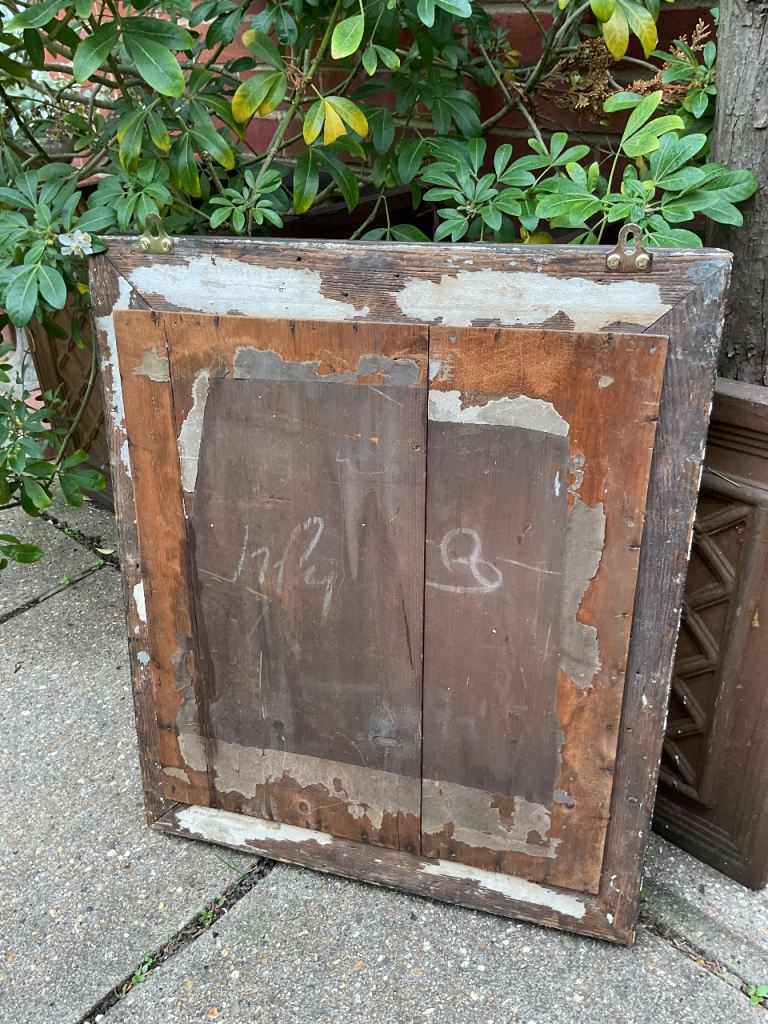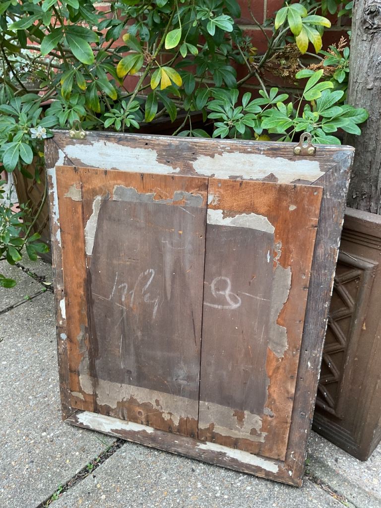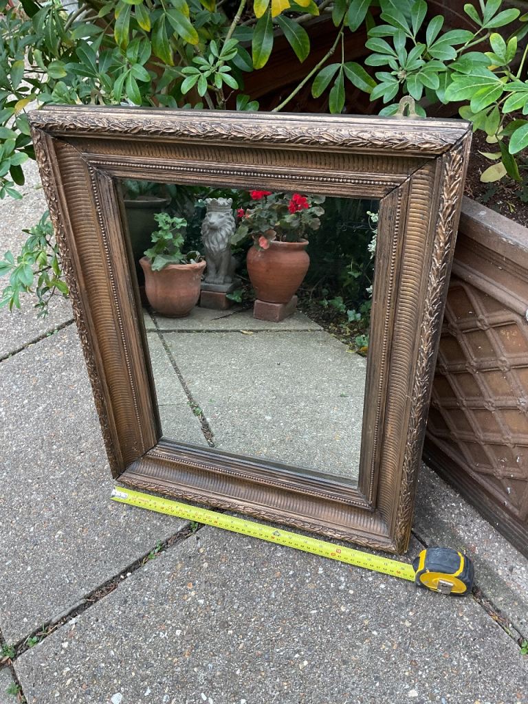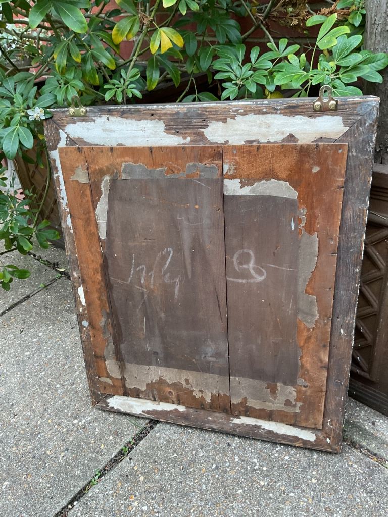 FOR SALE IS A LOVELY VINTAGE WOOD WALL MIRROR WITH OLD WOODEN BACKING.