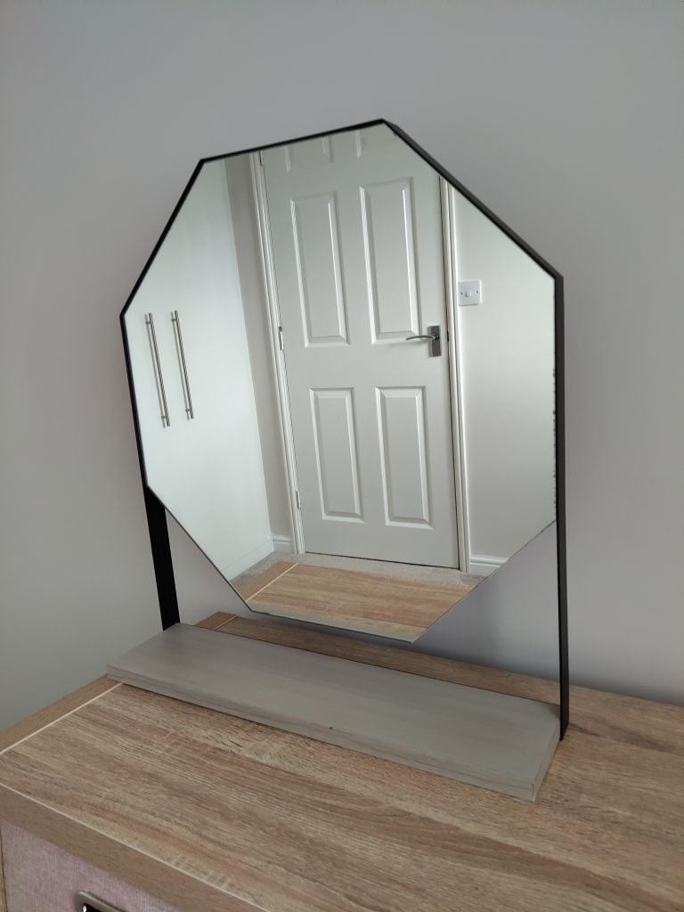Grey Bronx mirror with shelf. Octagon shape with black frame and light grey shelf. Height 57 cms x Width 50 cms.