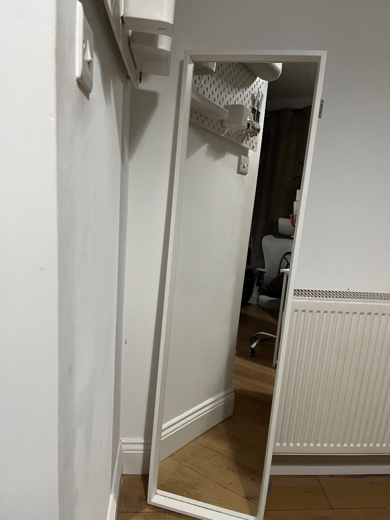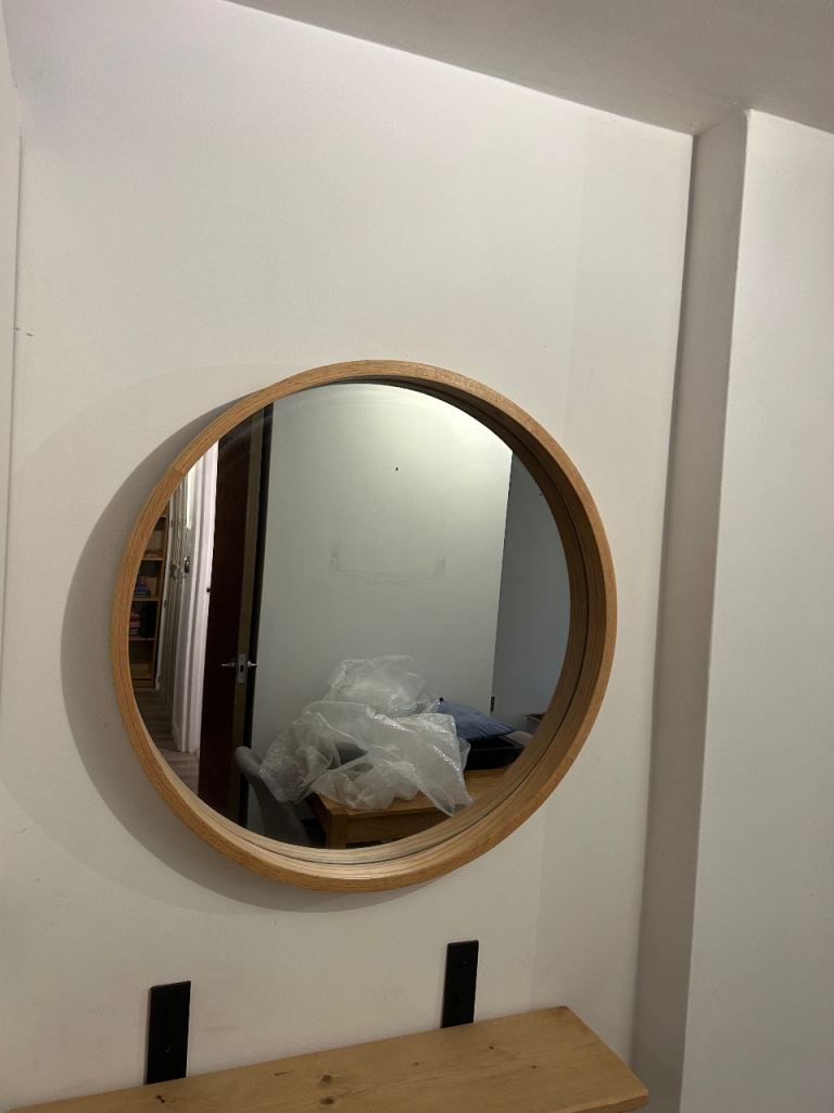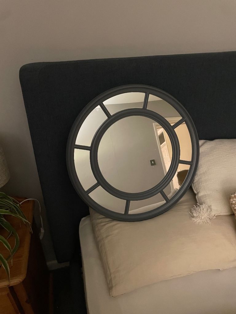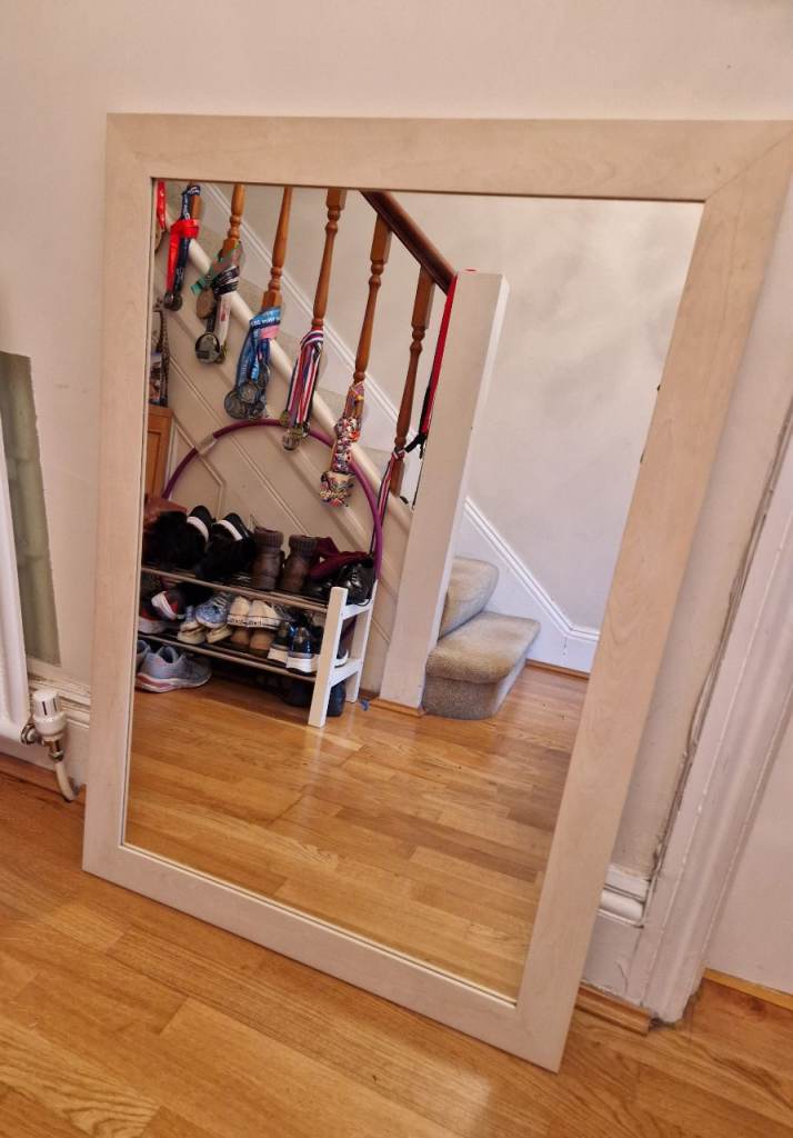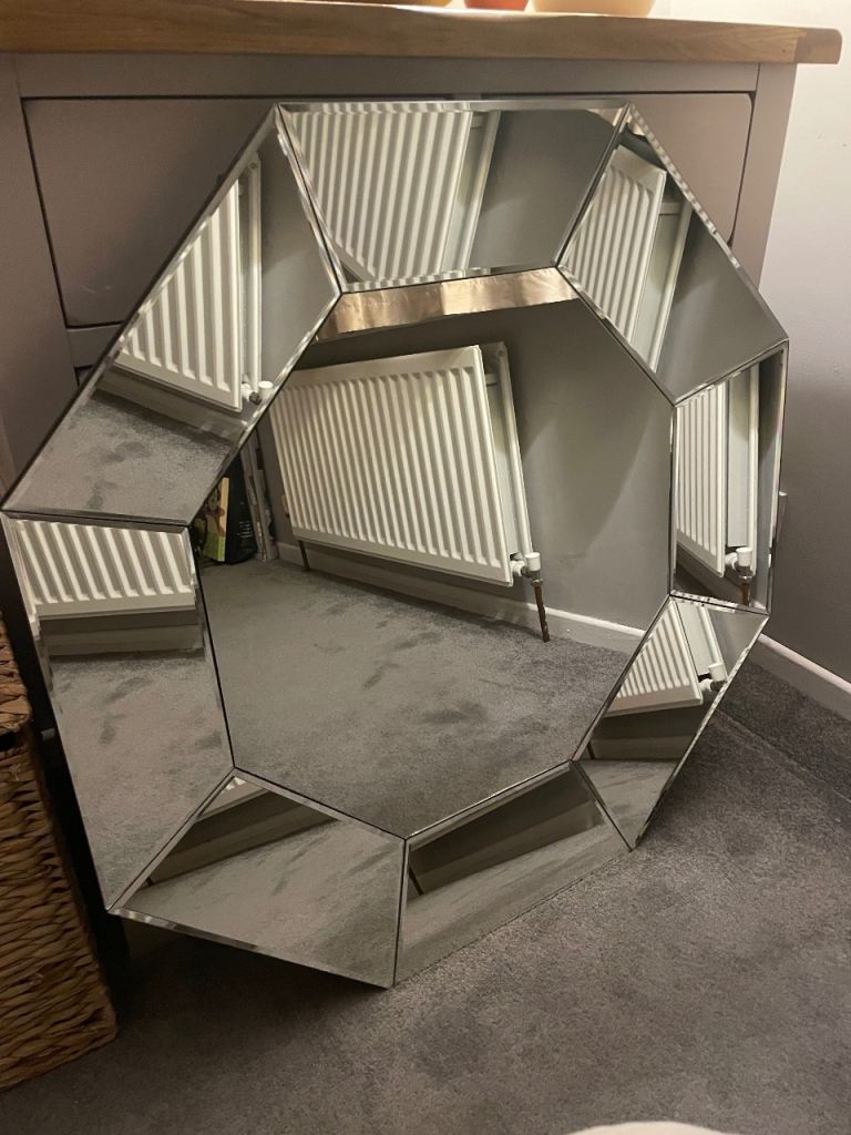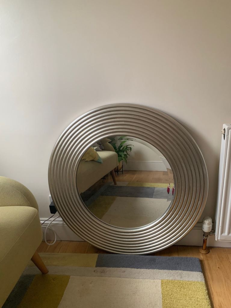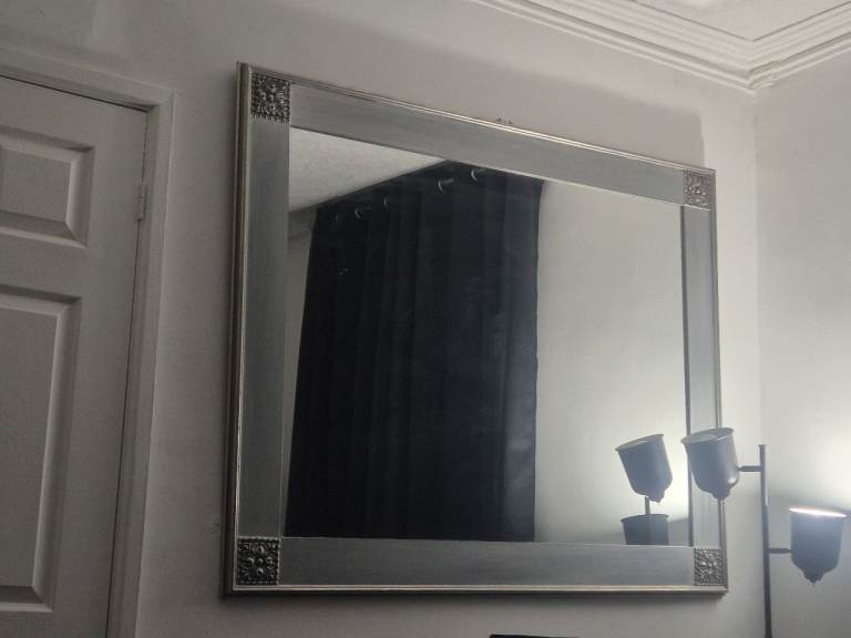 Large wall mirror (37" x 27") with silver coloured frame. Good condition