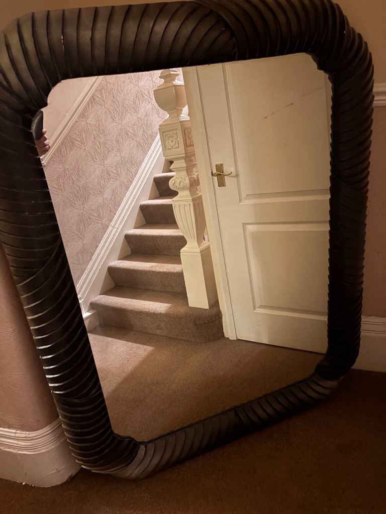 Large (150 x 120cm) wooden framed mirror , in good as new in condition for sale. Can used be floor standing (as pictured) or hung but aware that mirror is a heavy item. Cost £240 new